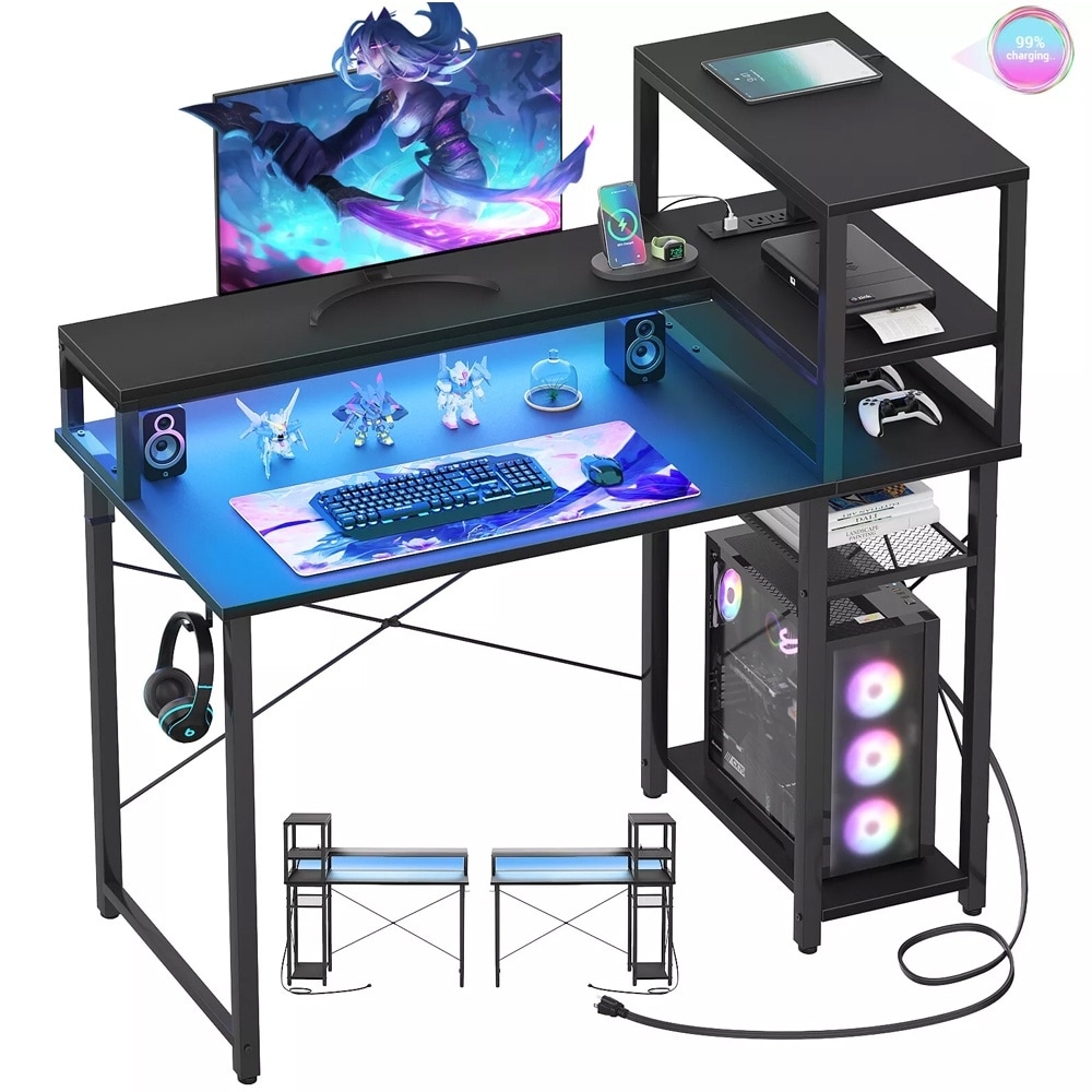 Gaming Desk Computer Desk Home Office Power Outlets & RGB Lights Black