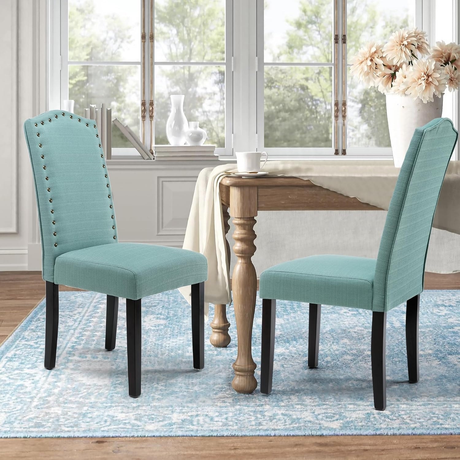 Modern High Back Fabric Upholstered Parsons Dining Room Chairs with Nail Head Trim and Solid Wood Legs, Set of 2, Green