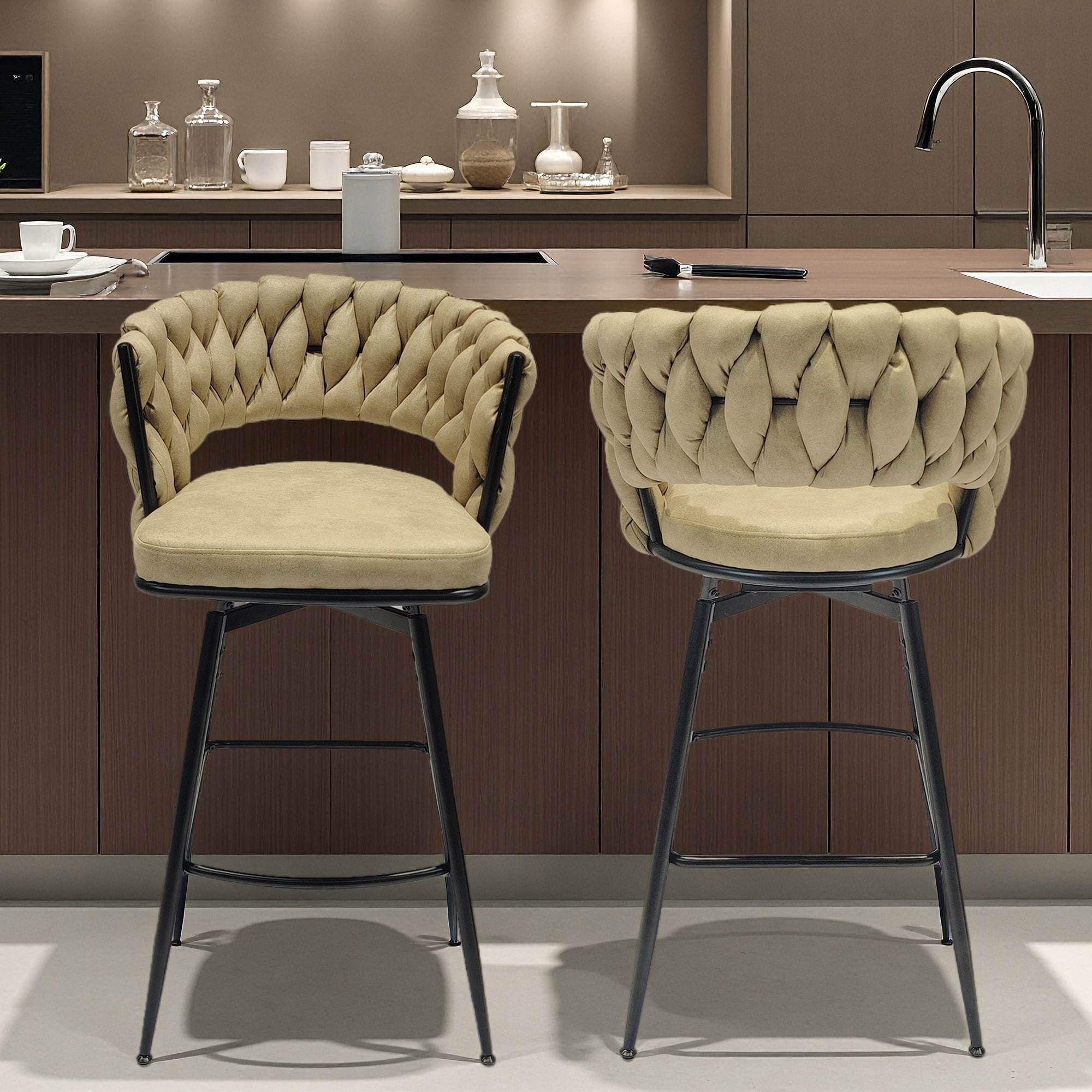 Linen Upholstered Swivel Bar Stools Set of 2 with Woven Backrest, Armrests, and Footrest