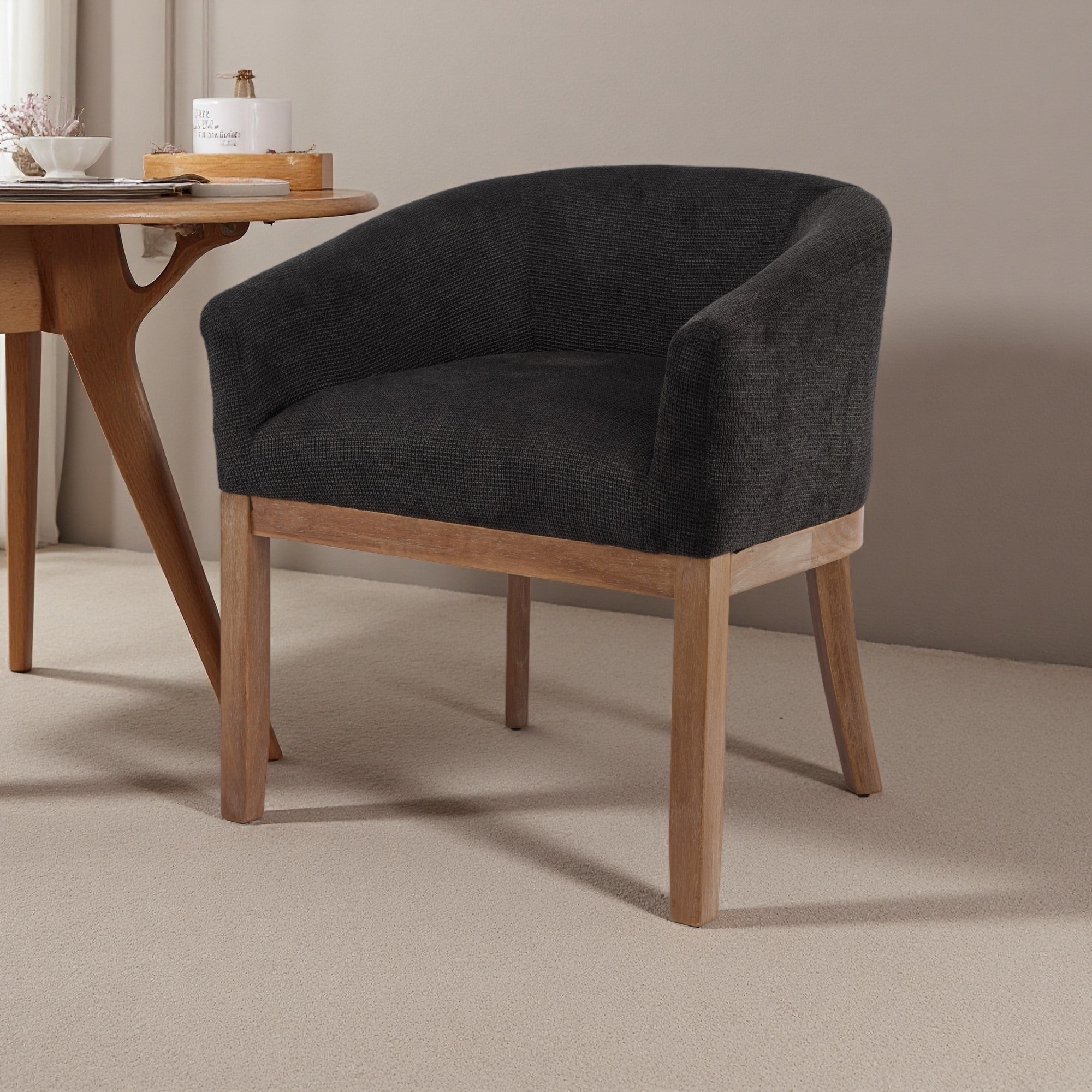 27.9"H Upholstered Barrel Dining Chair with Arms - Farmhouse Linen Accent Chair with Curved Legs and Natural Rubberwood Frame