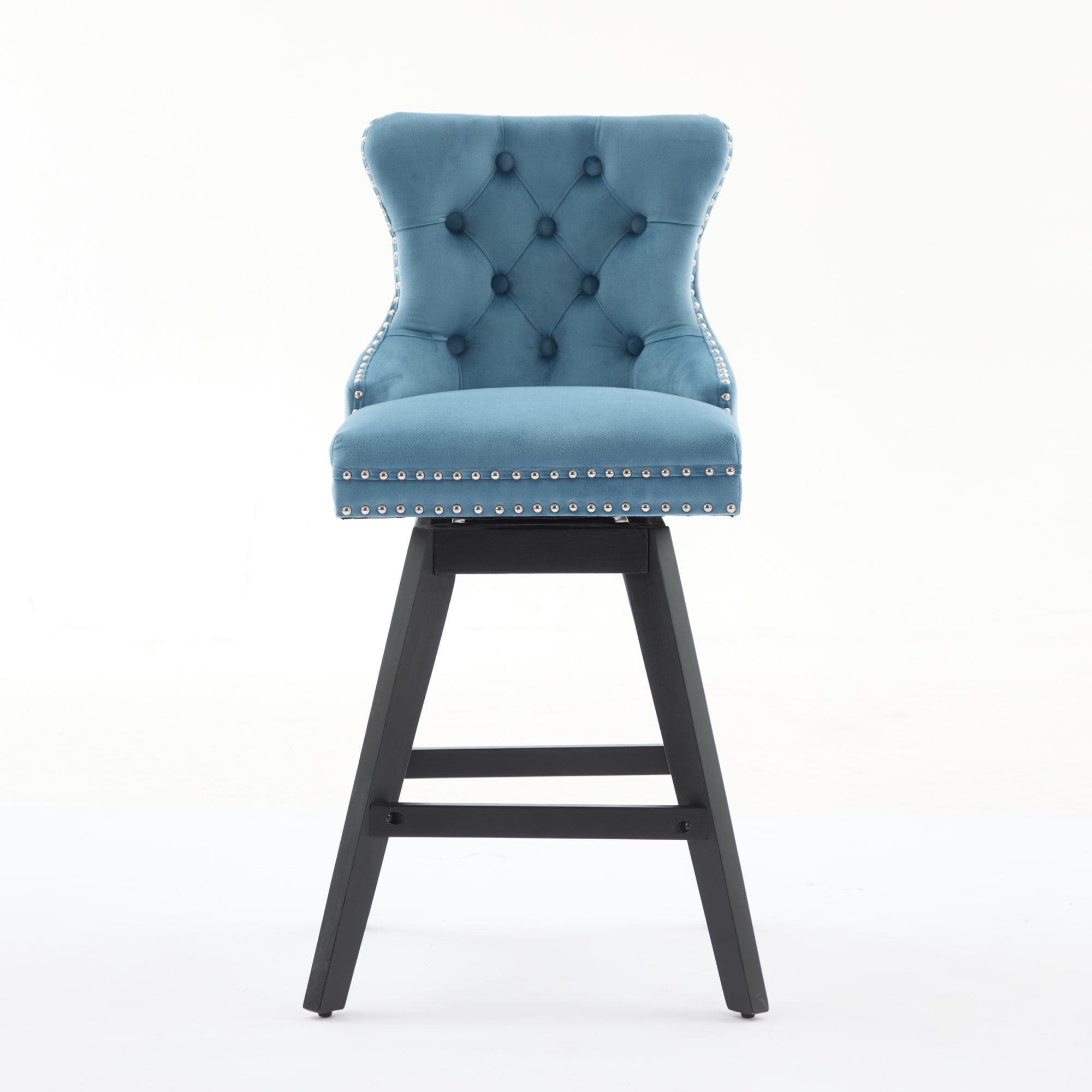 Swivel Velvet Barstools with Button Tufted Decoration and Wooden Legs, and Chrome Nailhead Trim, Set of 2