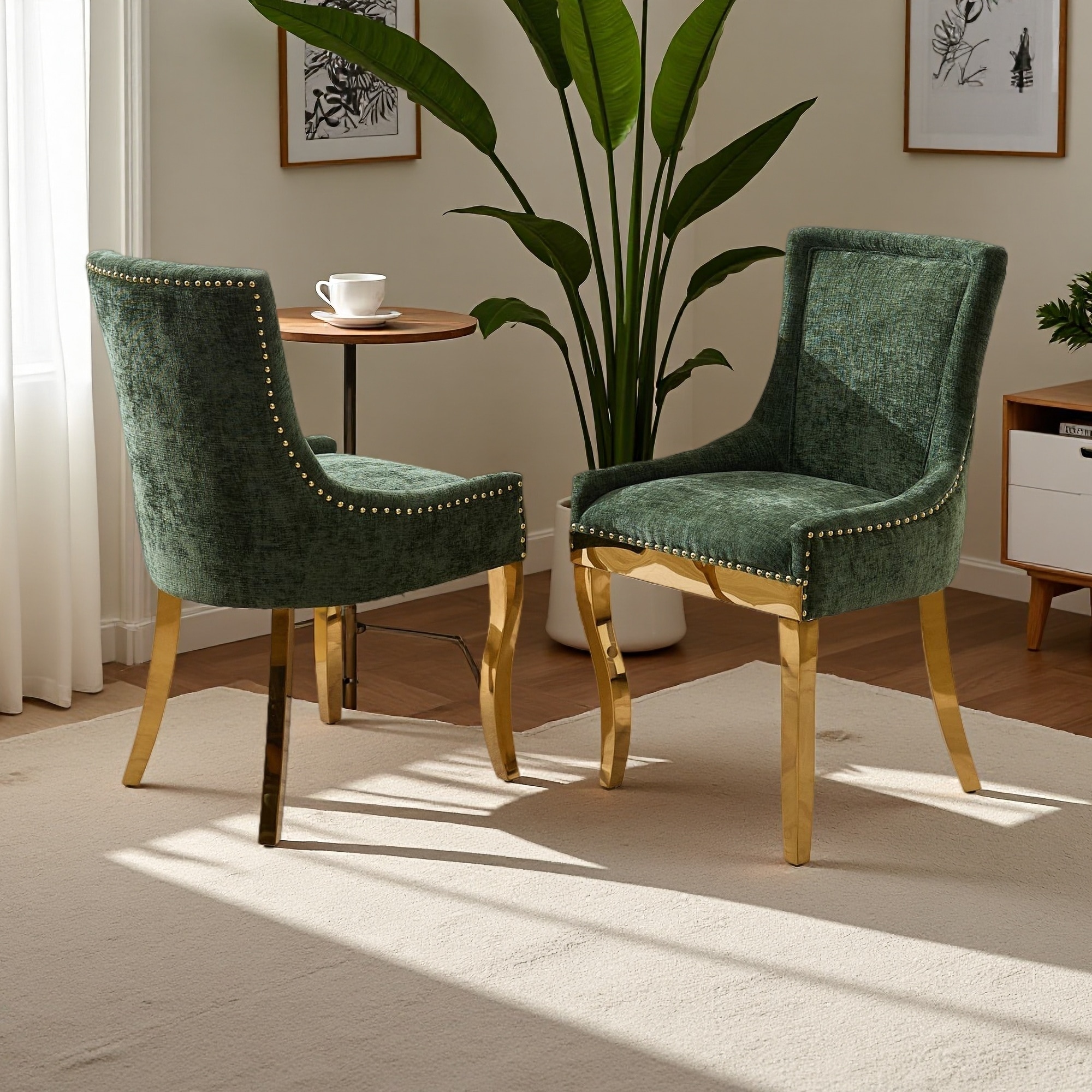 36.4"H Set of 2 Chenille Upholstered Dining Chairs with Gold-Plated Legs & Rivet Trim