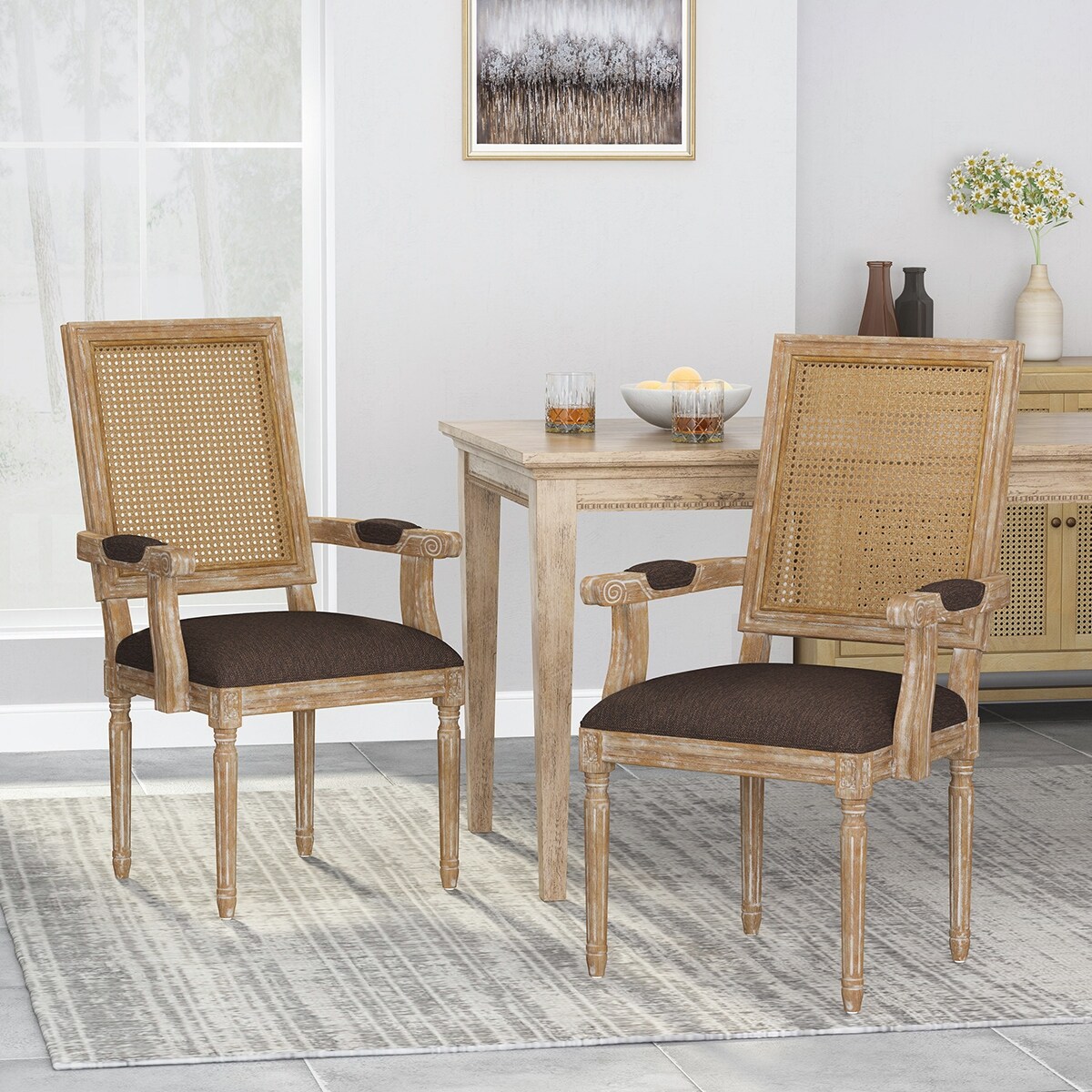 Rattan Dining Chair - Natural Brown Armrest Accent Chair - Boho Style Furniture for Kitchen or Dining Room