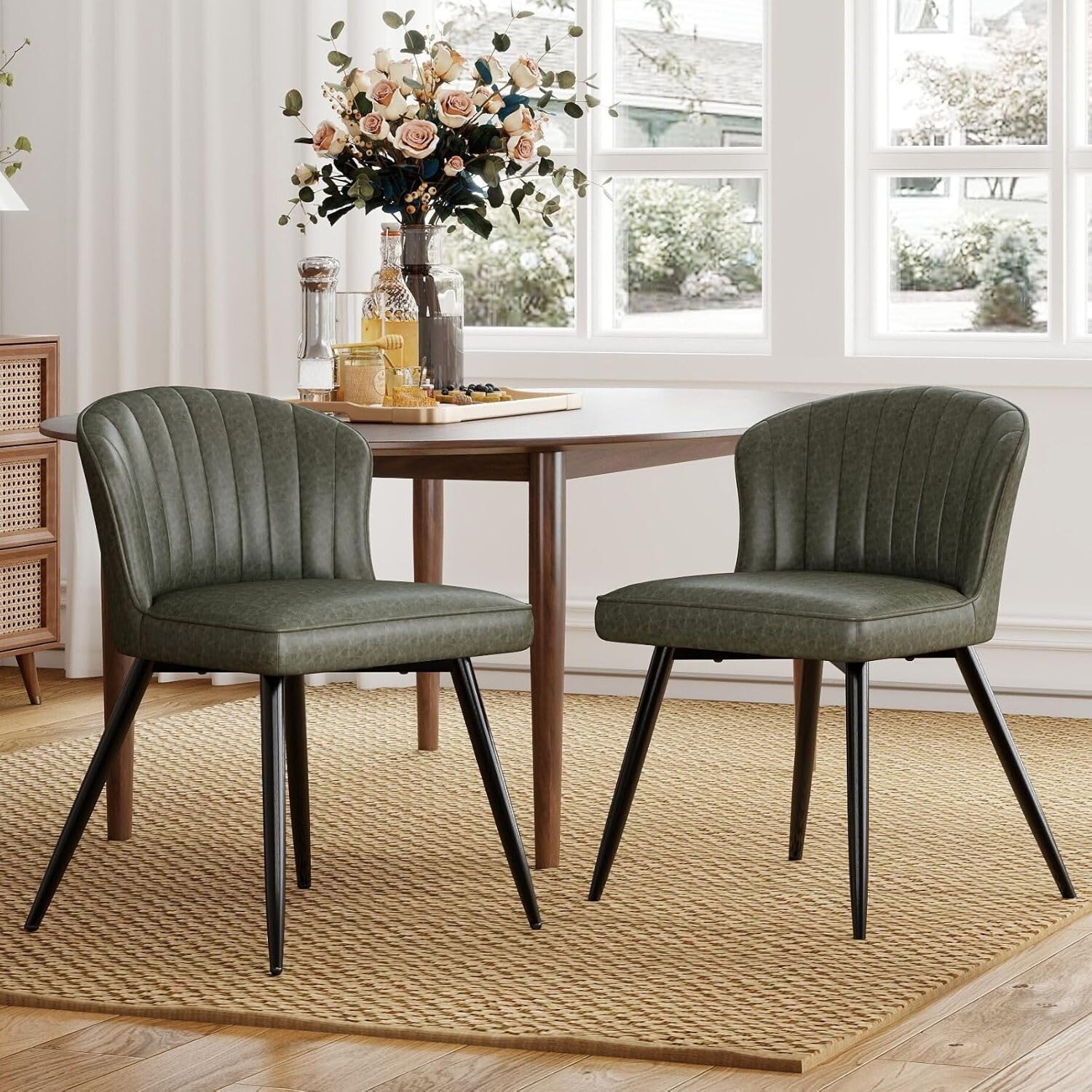 Modern Green Faux Leather Dining Chairs Set of 2 with Black Metal Legs, Comfortable Upholstered Kitchen Chairs