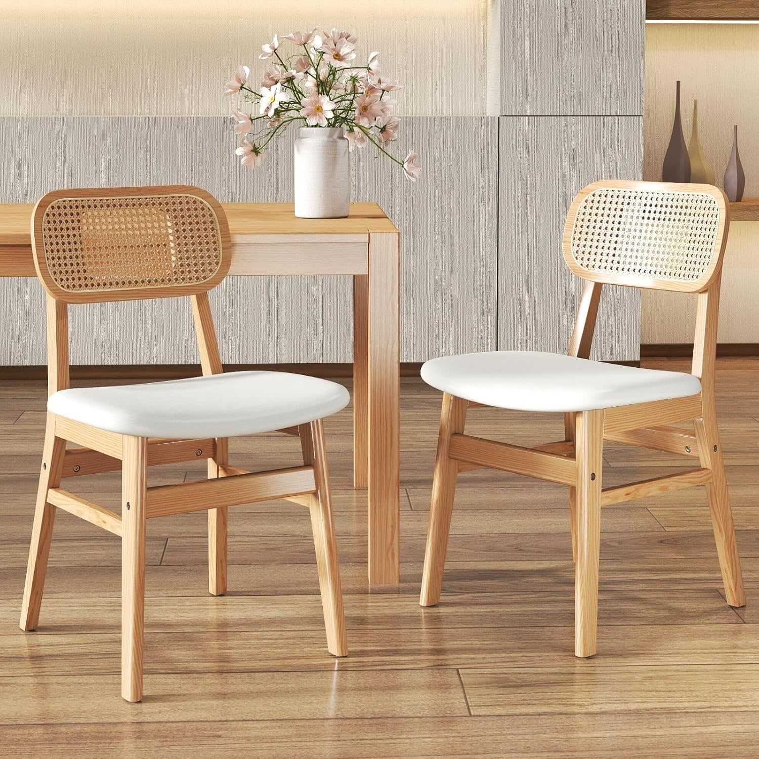 Set of 2 Beige Linen Fabric Rattan Dining Chairs with Natural Wooden Frame for Farmhouse Style
