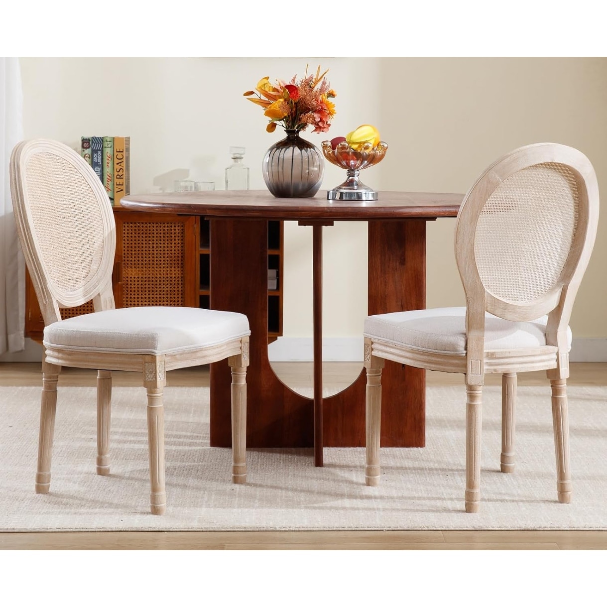 Set of 2 Round Rattan Back French Country Dining Chairs with Rustic Wood Legs, Beige