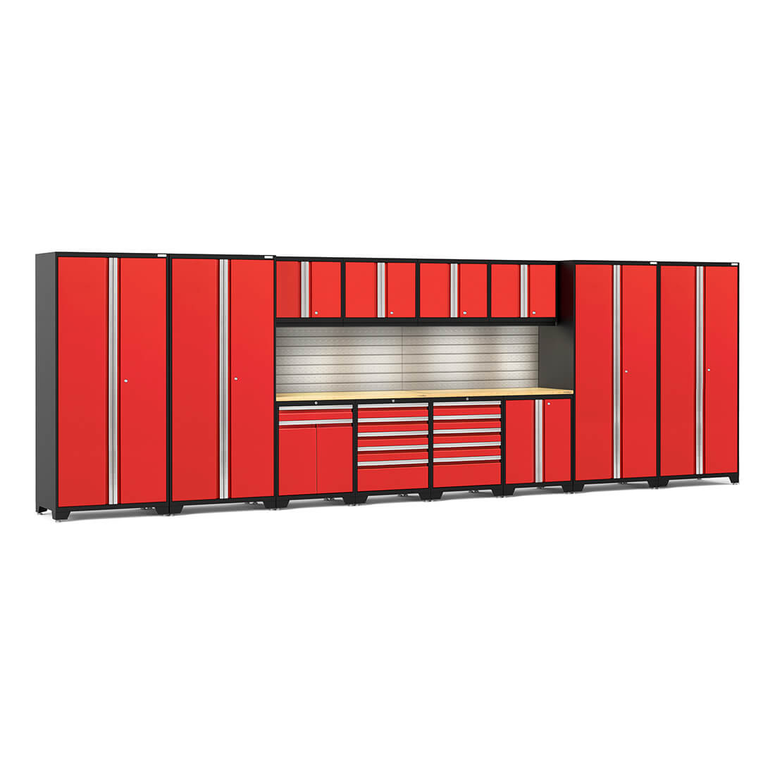 Newage Products Pro 3.0 Series 9-Piece Garage Cabinet Set With Multi-Function Cabinet, Red / Bamboo Worktop / None