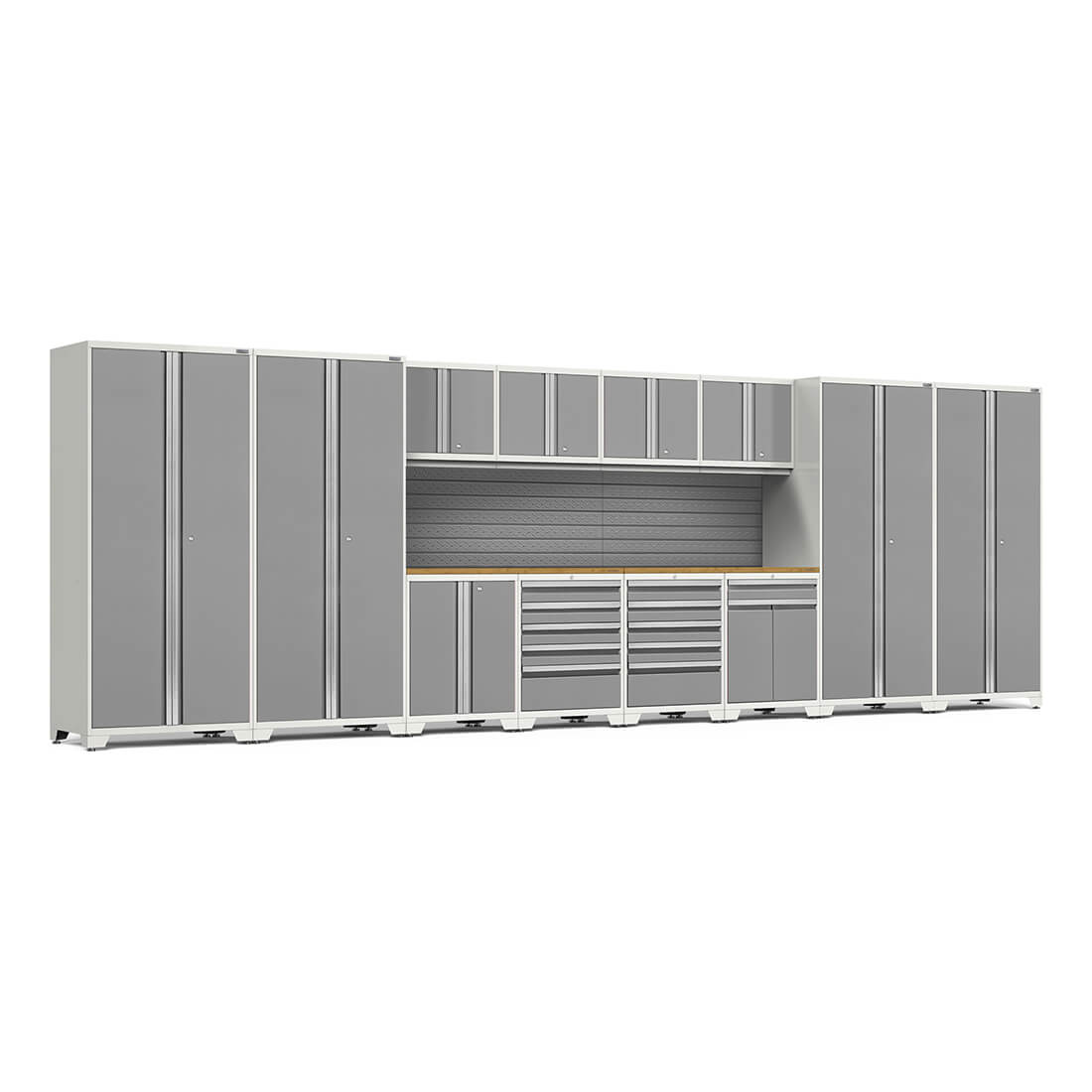 Newage Products Pro 3.0 Series 14-Piece Garage Cabinet Set With Multi-Function Cabinet, Platinum / Bamboo Worktop / Slatwall Backsplash