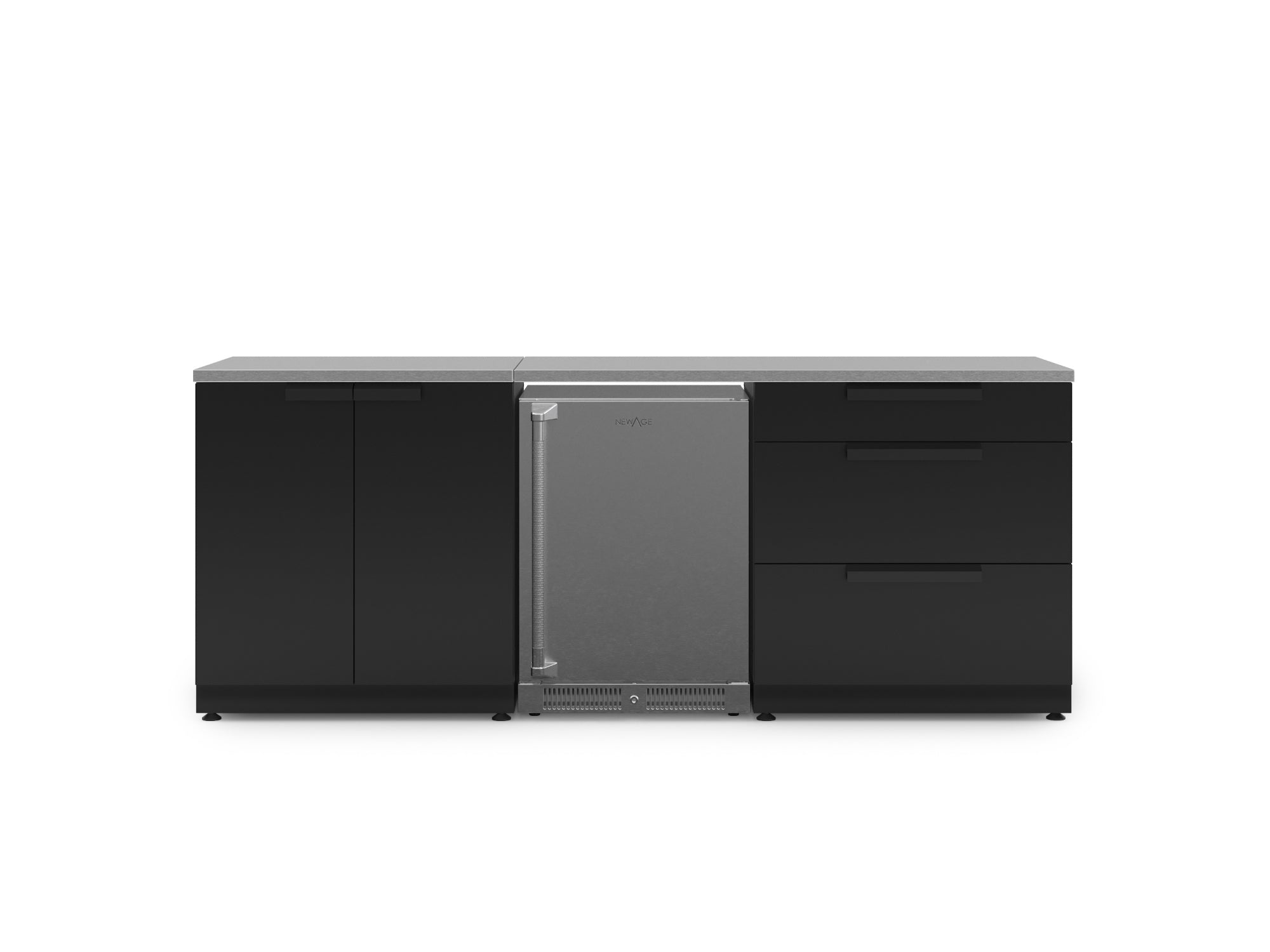 NewAge Outdoor Kitchens Aluminum 4-Piece Cabinet Set with 3-Drawer, Bar, Grill Cabinet and Glass Door Fridge