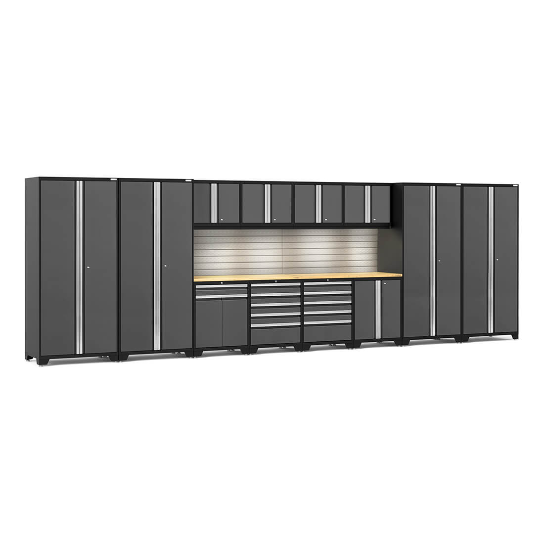 Newage Products Pro 3.0 Series 14-Piece Garage Cabinet Set With Multi-Function Cabinet, Grey / Bamboo Worktop / LED Lights + Slatwall Backsplash