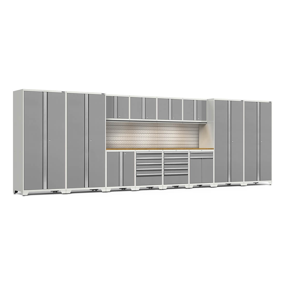 Newage Products Pro 3.0 Series 14-Piece Garage Cabinet Set With Multi-Function Cabinet, Platinum / Bamboo Worktop / LED Lights + Slatwall Backsplash