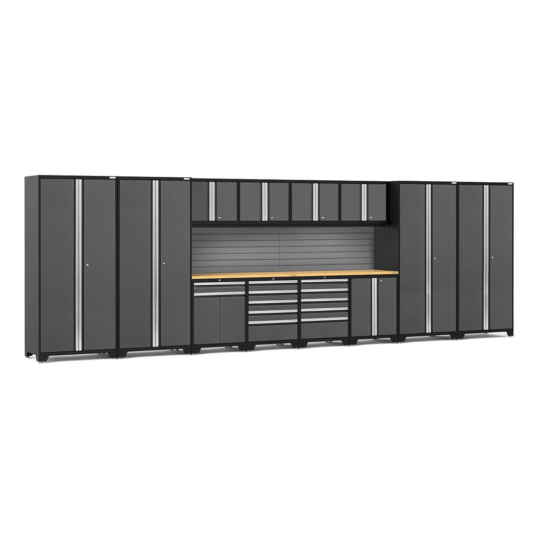 Newage Products Pro 3.0 Series 14-Piece Garage Cabinet Set With Multi-Function Cabinet, Grey / Bamboo Worktop / Slatwall Backsplash