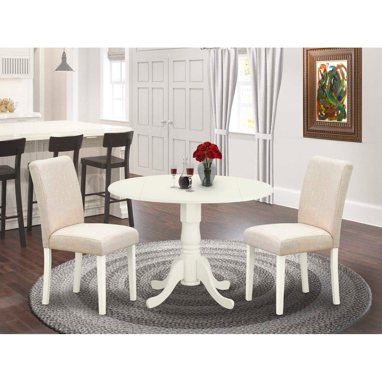 Round Dining Table Set 3pc 42" Table w/ Drop Leaves & 2 Parsons Chairs - Linen Beige Fabric