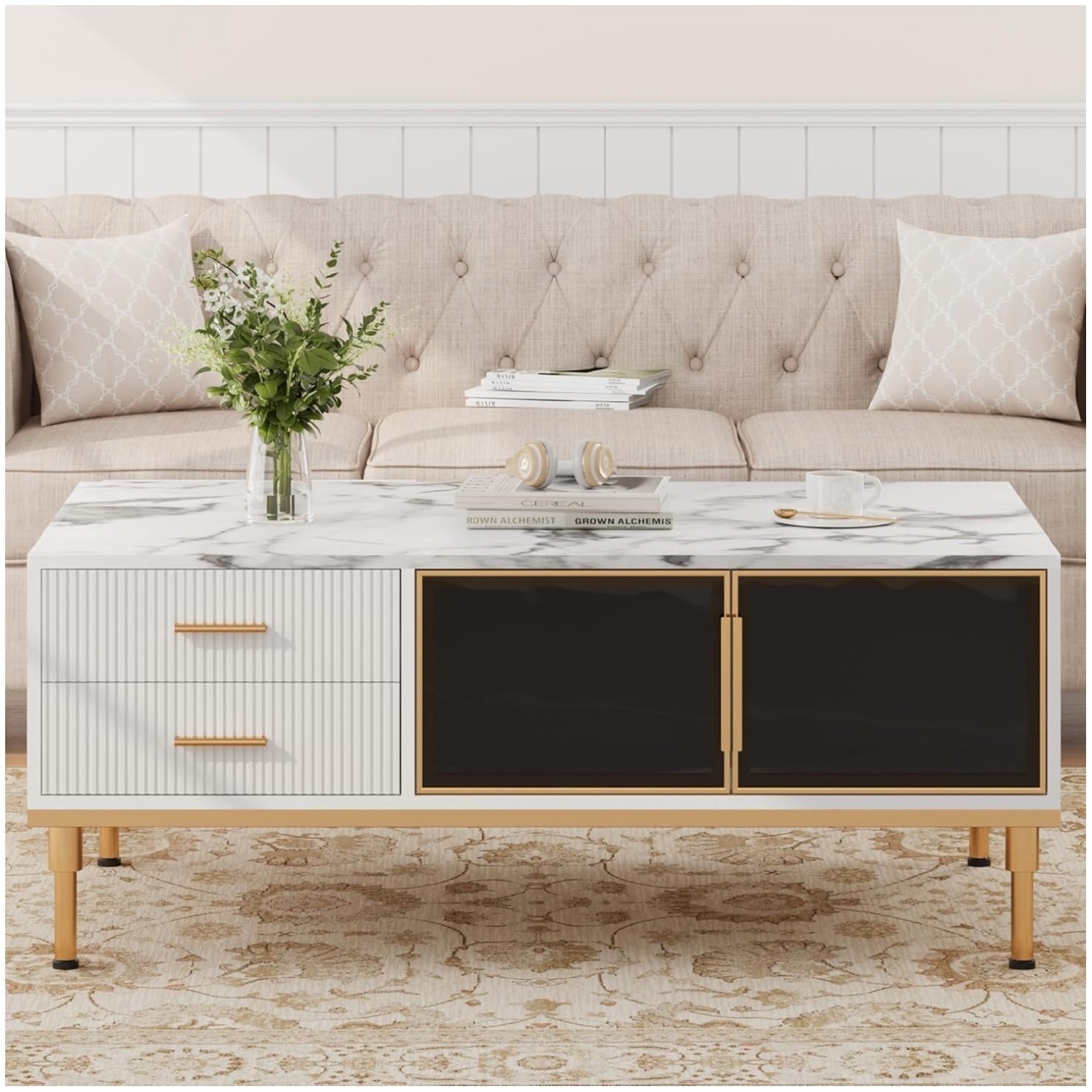 Modern Coffee Table with Glass Door & Wave Pattern Drawers, White Marble Top with Gold Metal Legs