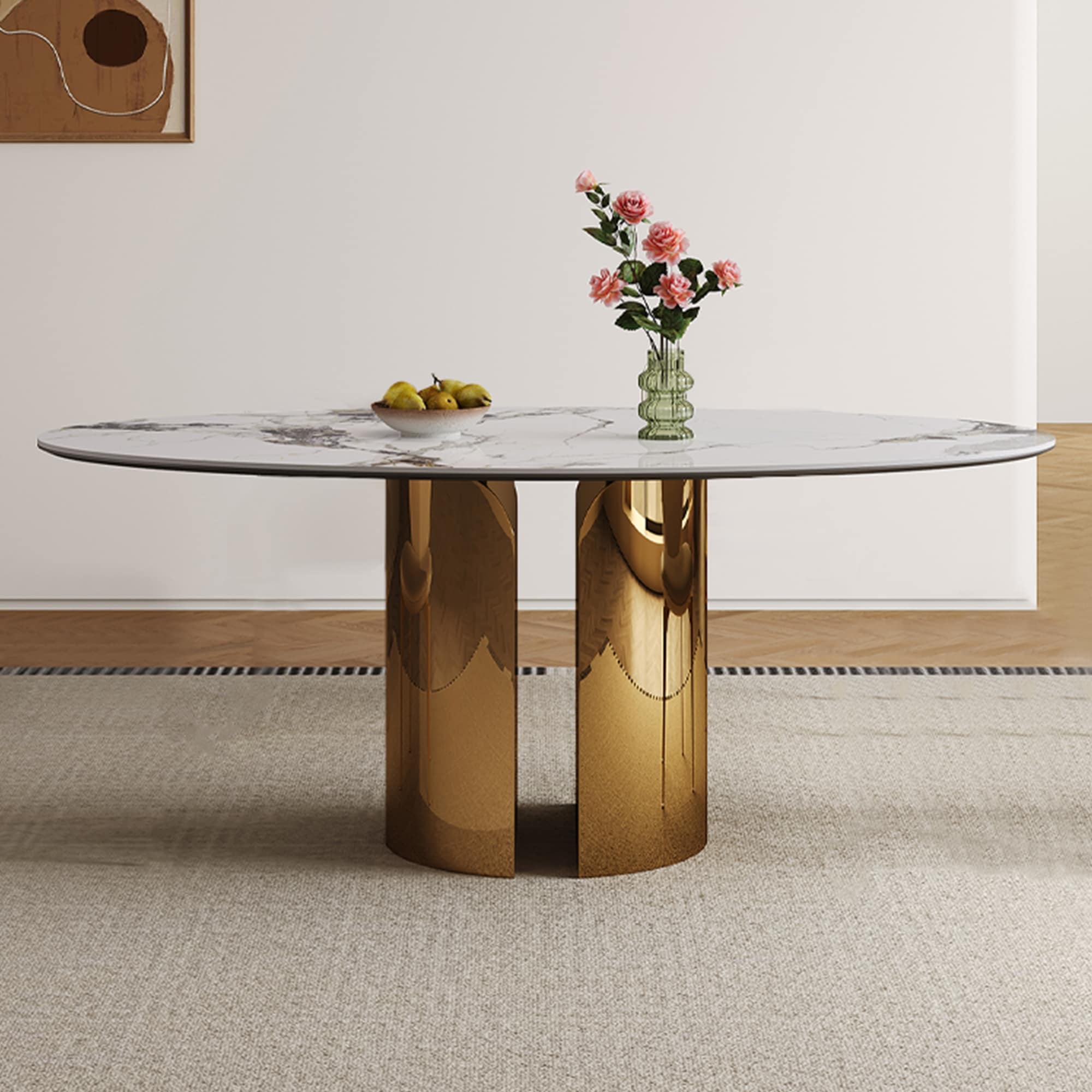 70.9" Sintered Stone Oval Dining Table – Copper-Colored Stainless Steel Base, Unique Leg Design (Sturdy & Stable). - 70.9-inch