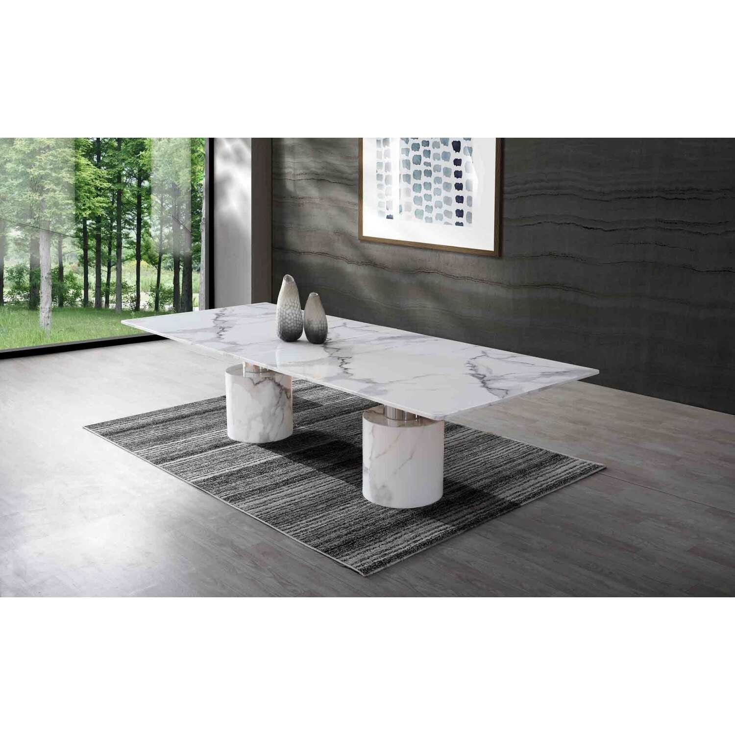 Extra Large Dining Table - White Marble Glossy Top with Stainless Steel Base for Dining Room - 63