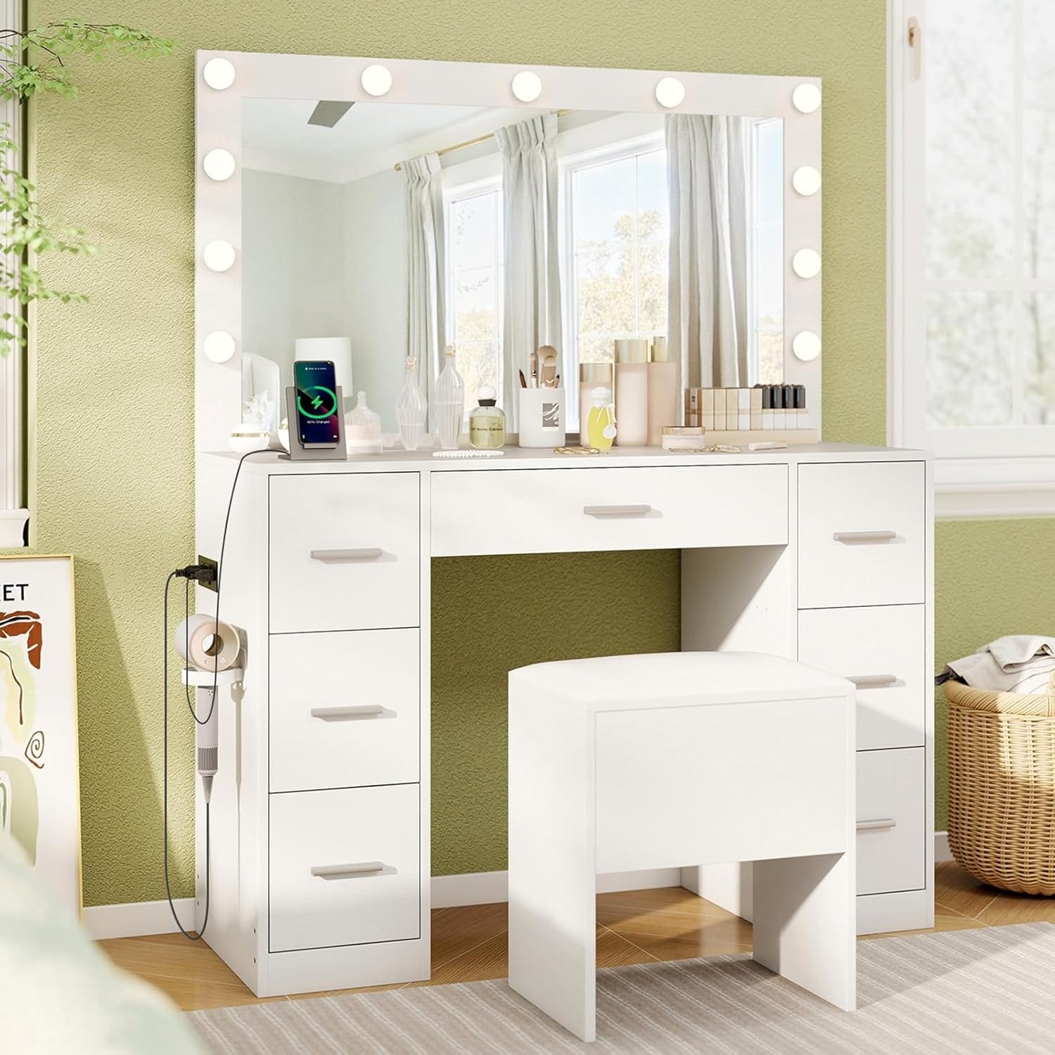 Modern White Makeup Vanity Desk with LED Mirror, Charging Station, 7 Drawers, and Storage Stool