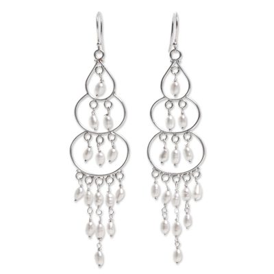 Moonlit Orbs,'Sterling Silver Cultured Pearl Chandelier Earrings Indonesia'