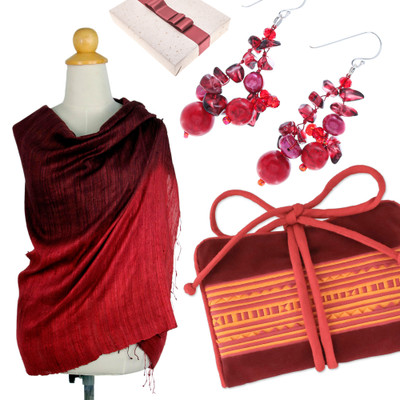 Trendy Red,'Curated Gift Set with Shawl Earrings and Jewelry Roll in Red'