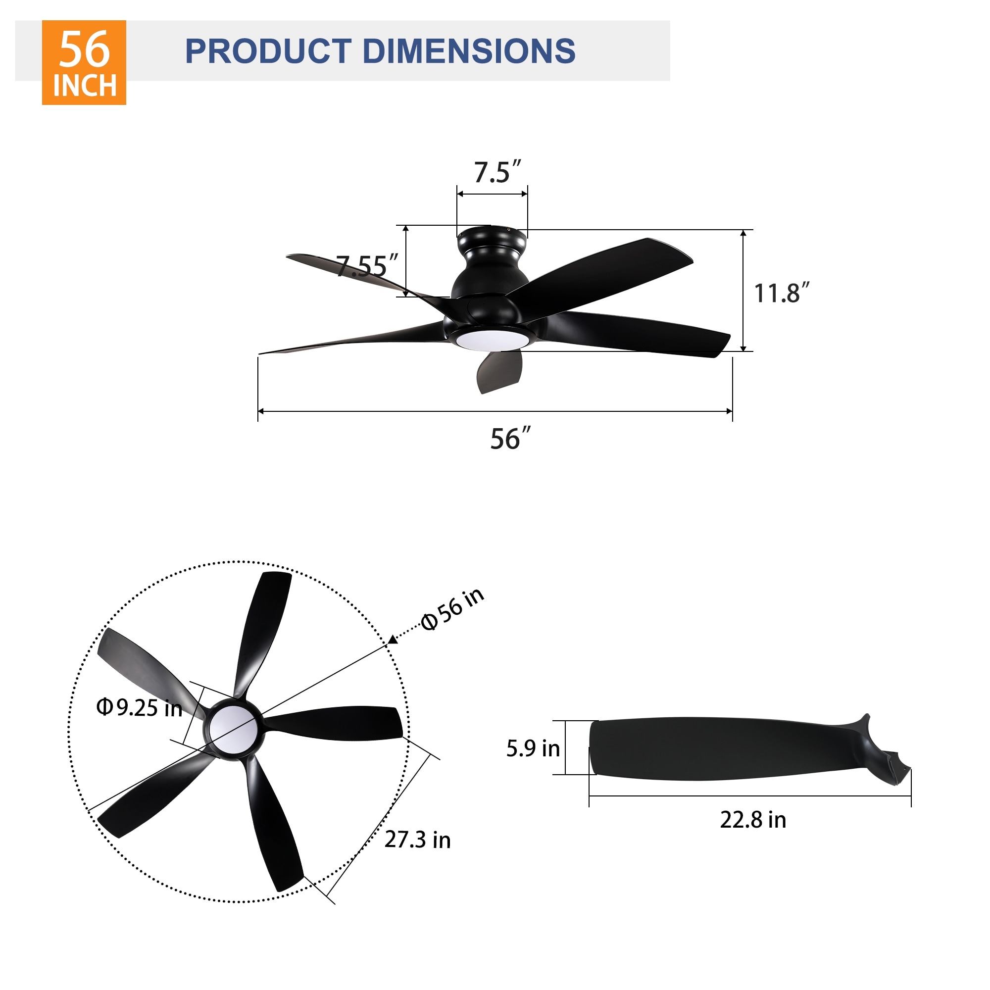 56" 5 PCS ABS Blades Ceiling Fan w/Light Kit 3 Color LED Light Source