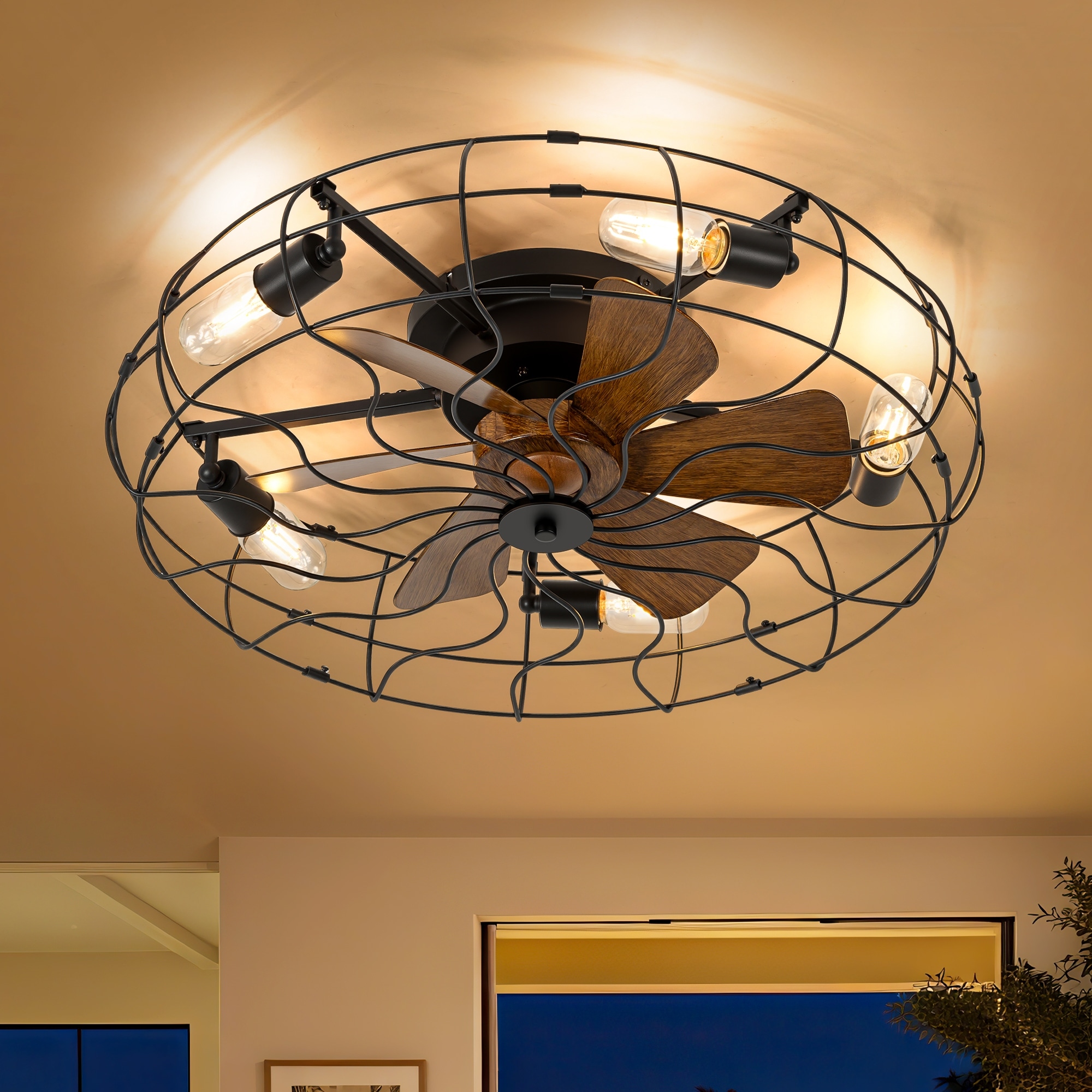 19-in Black Enclosed/Low Profile Indoor Flush Mount Cage Ceiling Fan with Light Remote (7-Blade)