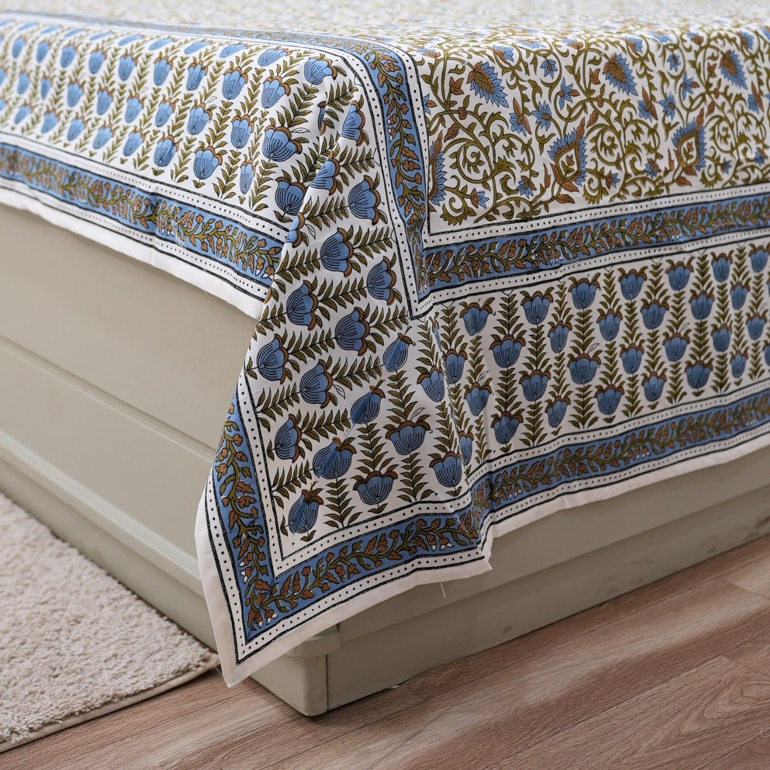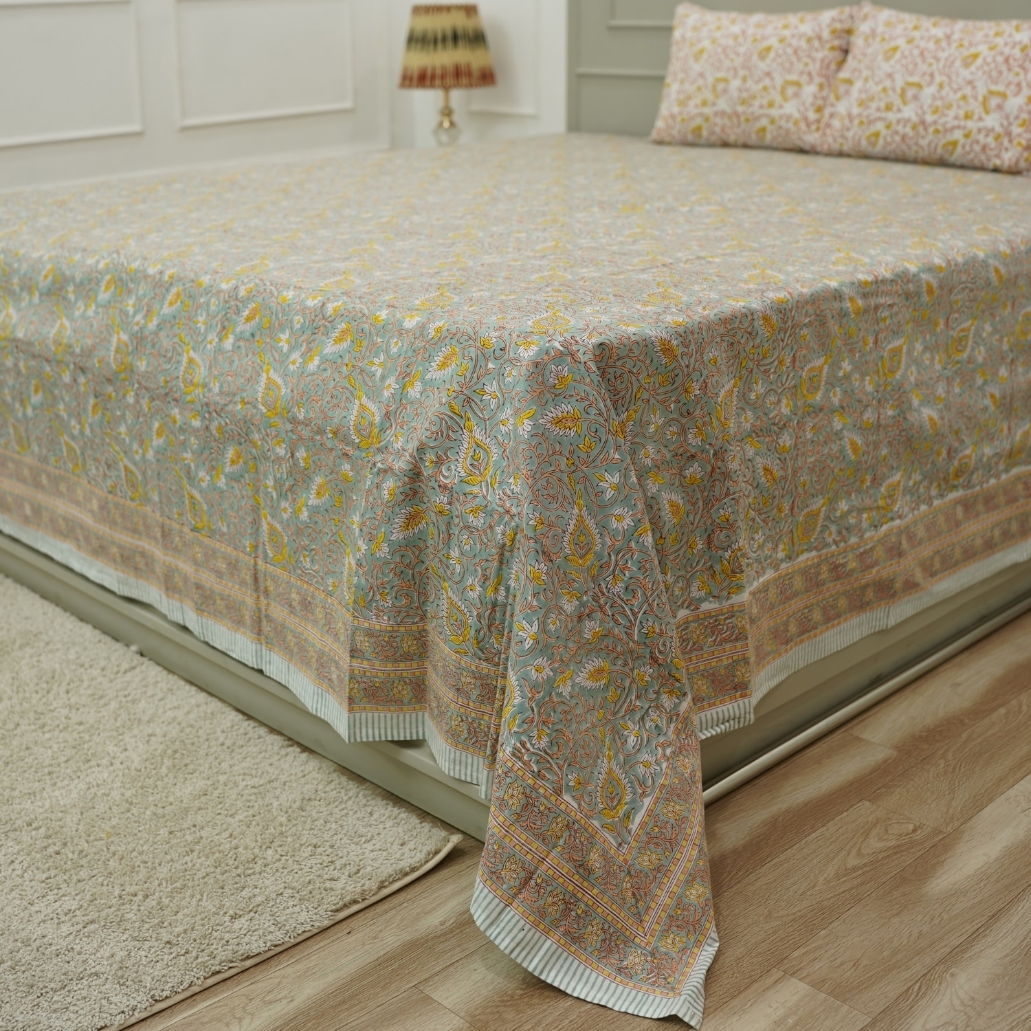 Fabdivine Handmade Block Print Floral Bed Sheet, Pillow Cover Gift Cotton Fabric Home Décor