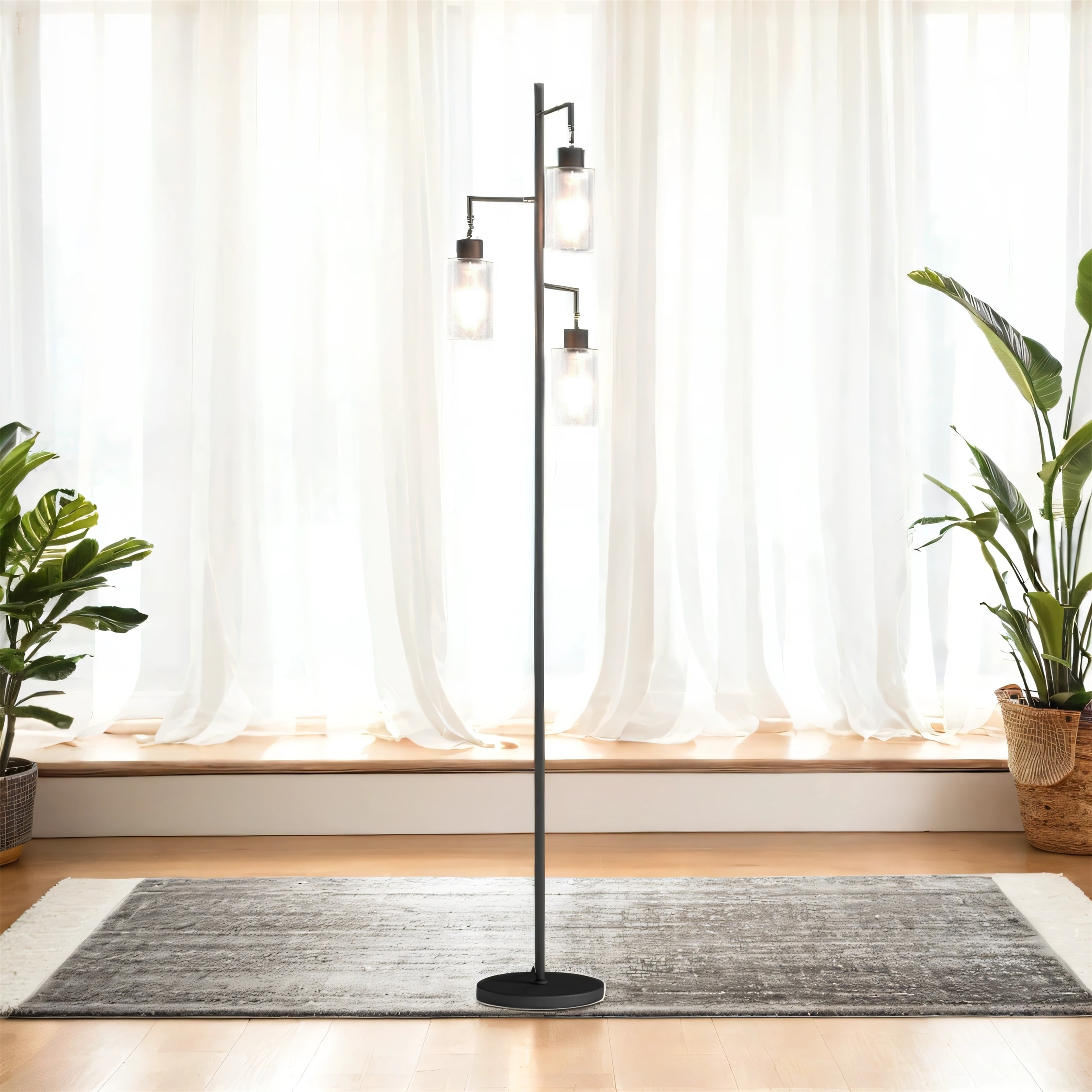 67" Tree-Shaped Living Room Floor Lamp with 3 Lights, Glass Lampshade and Foot Switch