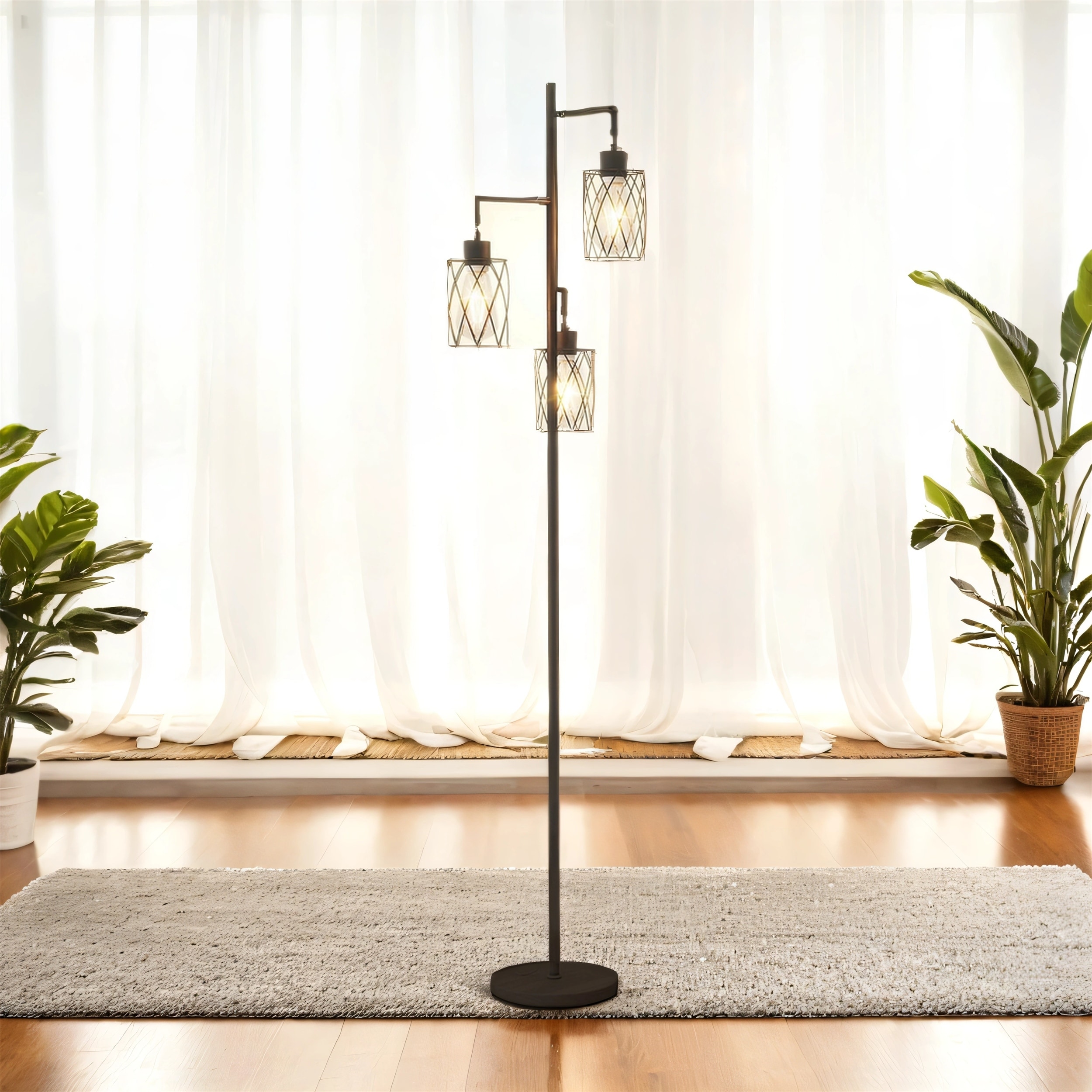 3-Light Tree Floor Lamp with Cage Shades, Adjustable, Foot Switch