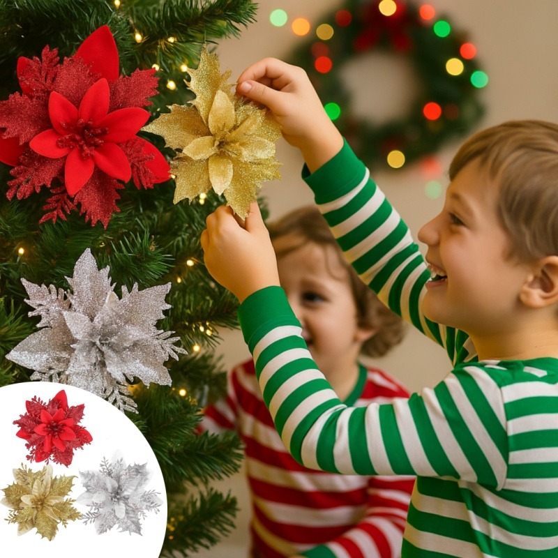 14cm Glitter Artificial Christmas Flowers With Clips Tree Ornaments & Holiday Decorations red 20 Pcs