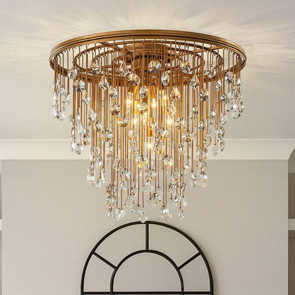 5/7-Light Contemporary and Glam Antique Gold Rain Drop Crystal Flush Mount