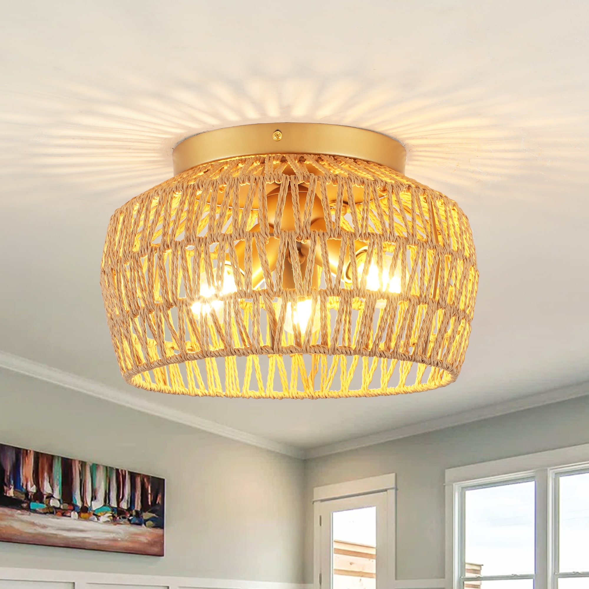 C Cattleya 1-Pack 2-Light Incandescent Woven Rattan Flush Mount Ceiling Light Fixture