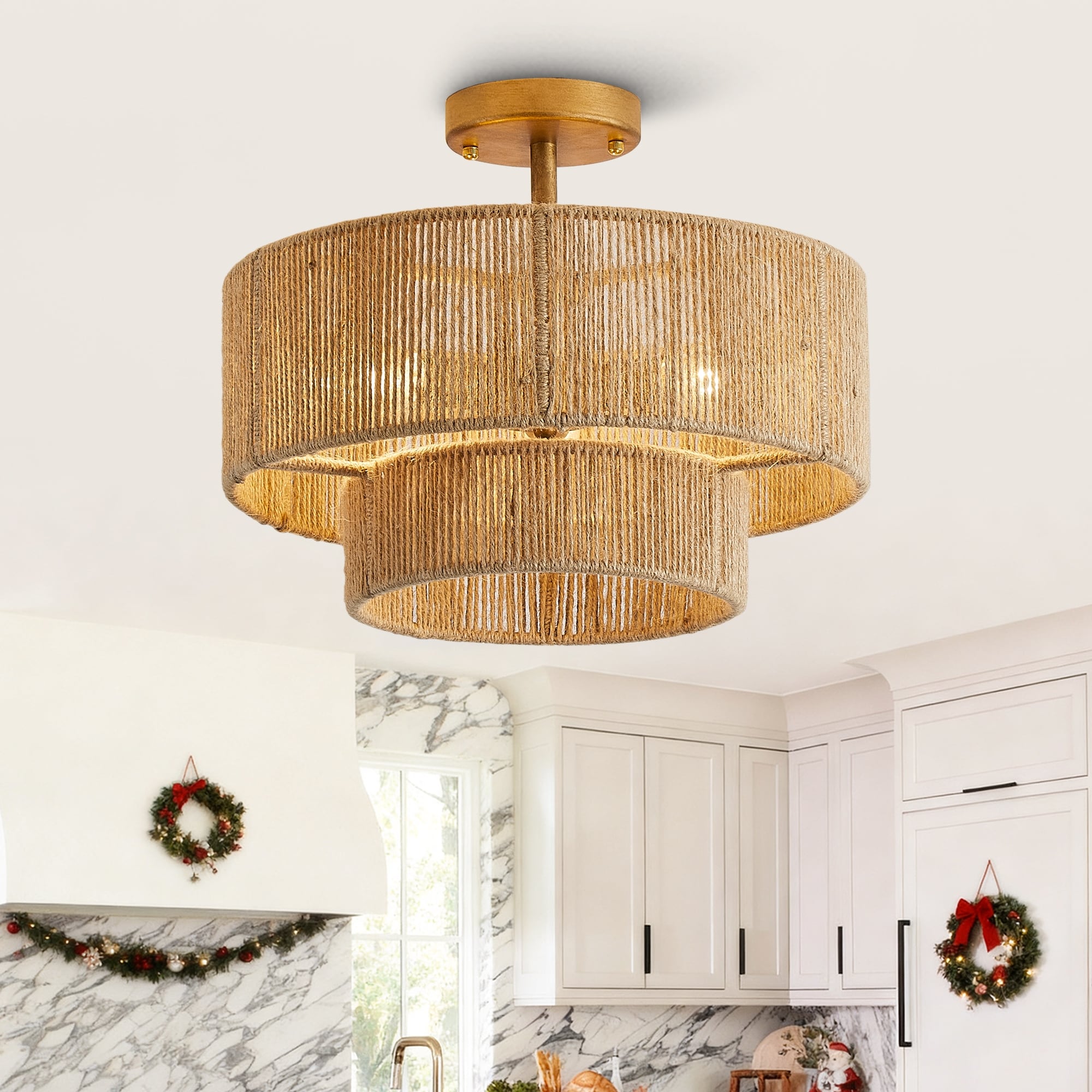 Bohemian Gold Natural Handmade Jute Rope 3-Light Two-Tier Drum Semi-Flush Mount Ceiling Light - 15.4" W x 12.6" H