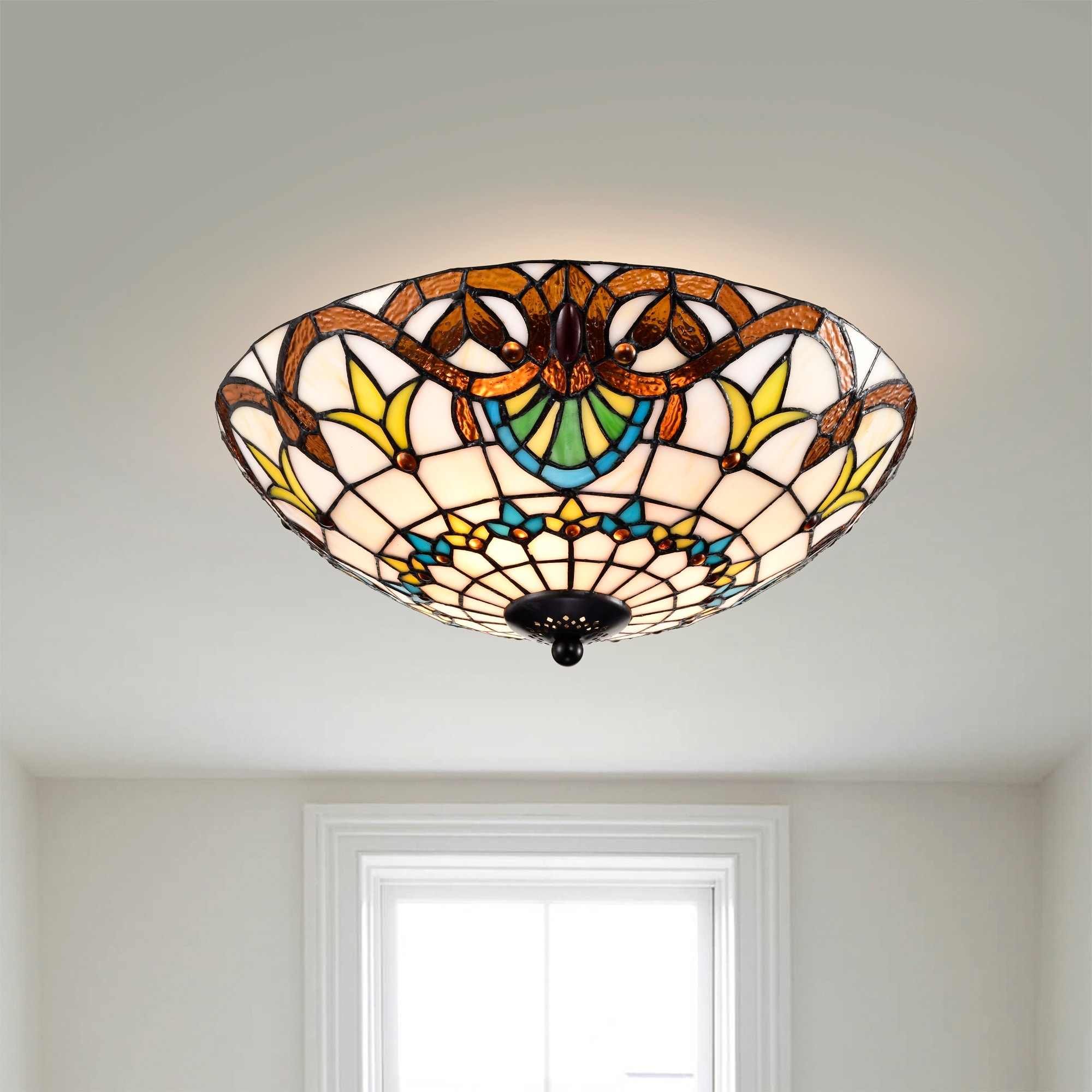 Elspeth Ivory Amber Flushmount Ceiling Lamp Tiffany Style Glass Shade - Ivory-Amber