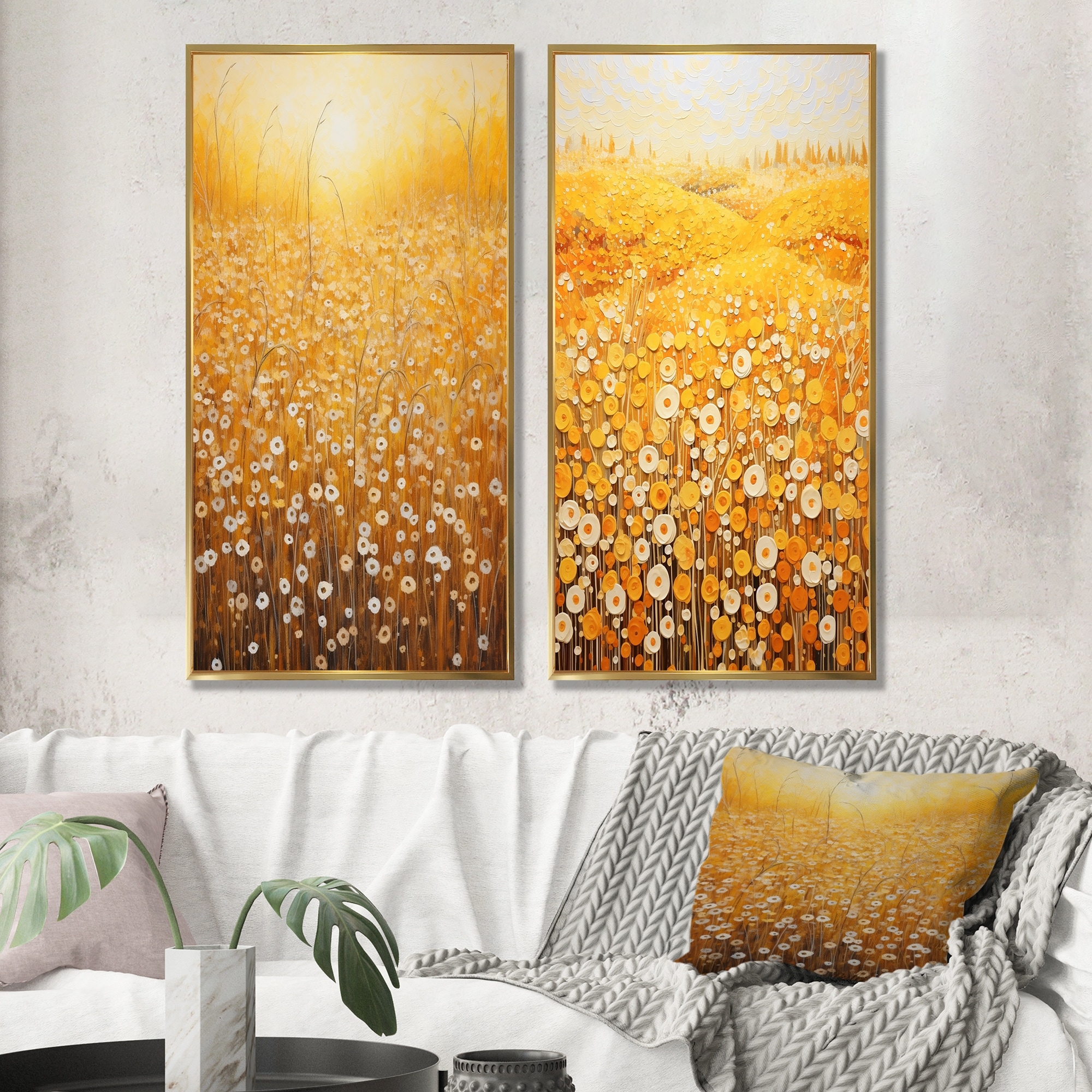 Designart "Golden Harvest Floral Field" Flower Framed Art Set Of 2 - Traditional Wall Art Set Yellow Wall Decor 2 Pieces