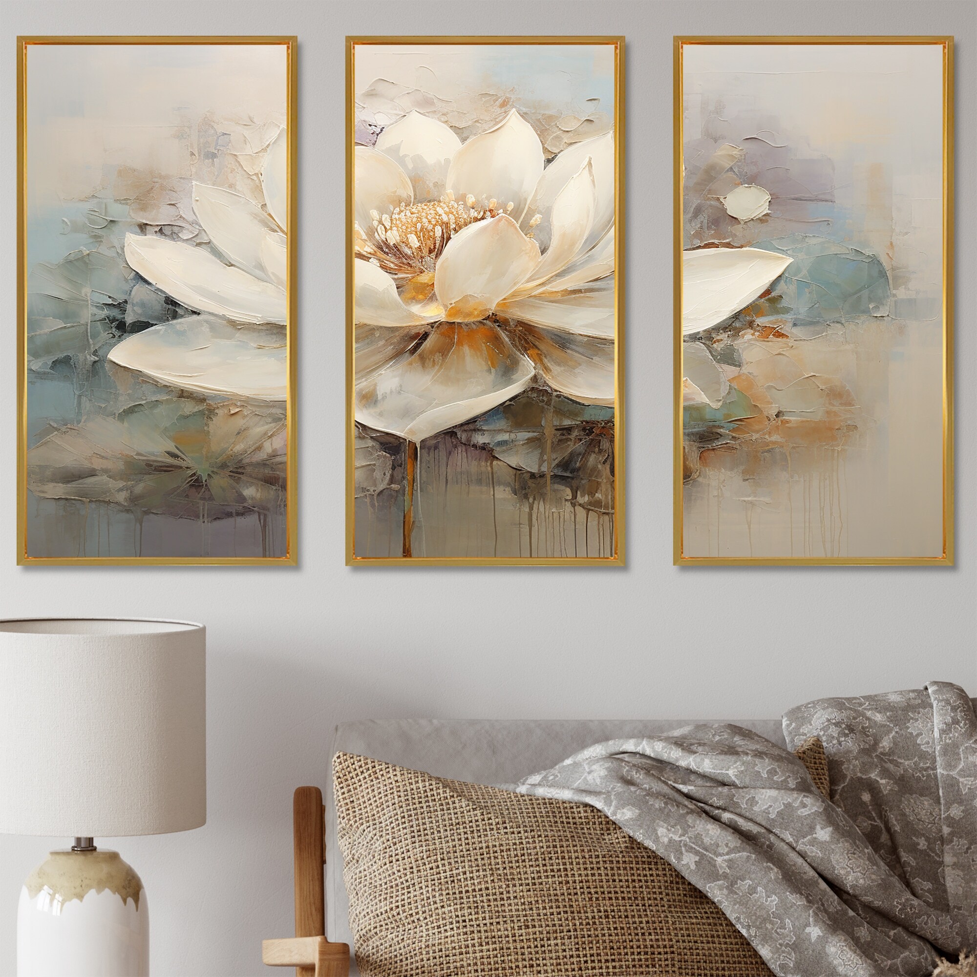 Designart "Antique Lotus Connection I" Lotus Framed Art Set of 3 - Modern Wall Art Set Beige Wall Decor 3 Pieces