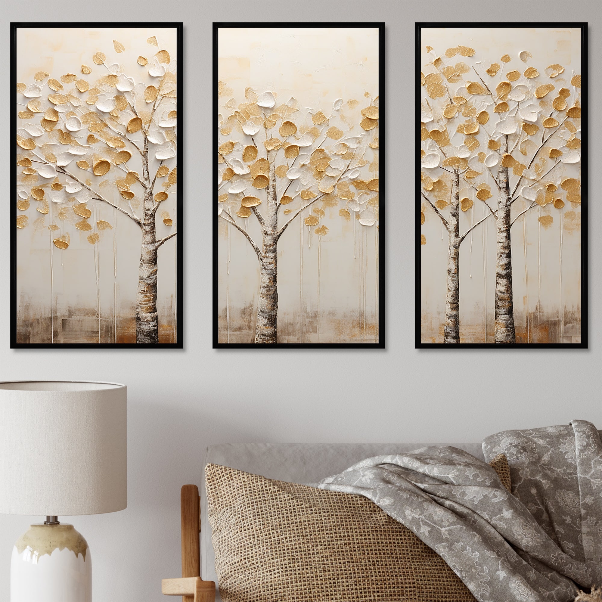 Designart "Beige Trees Harmony" Trees Framed Art Set of 3 - Traditional Wall Art Set Beige Wall Decor 3 Pieces