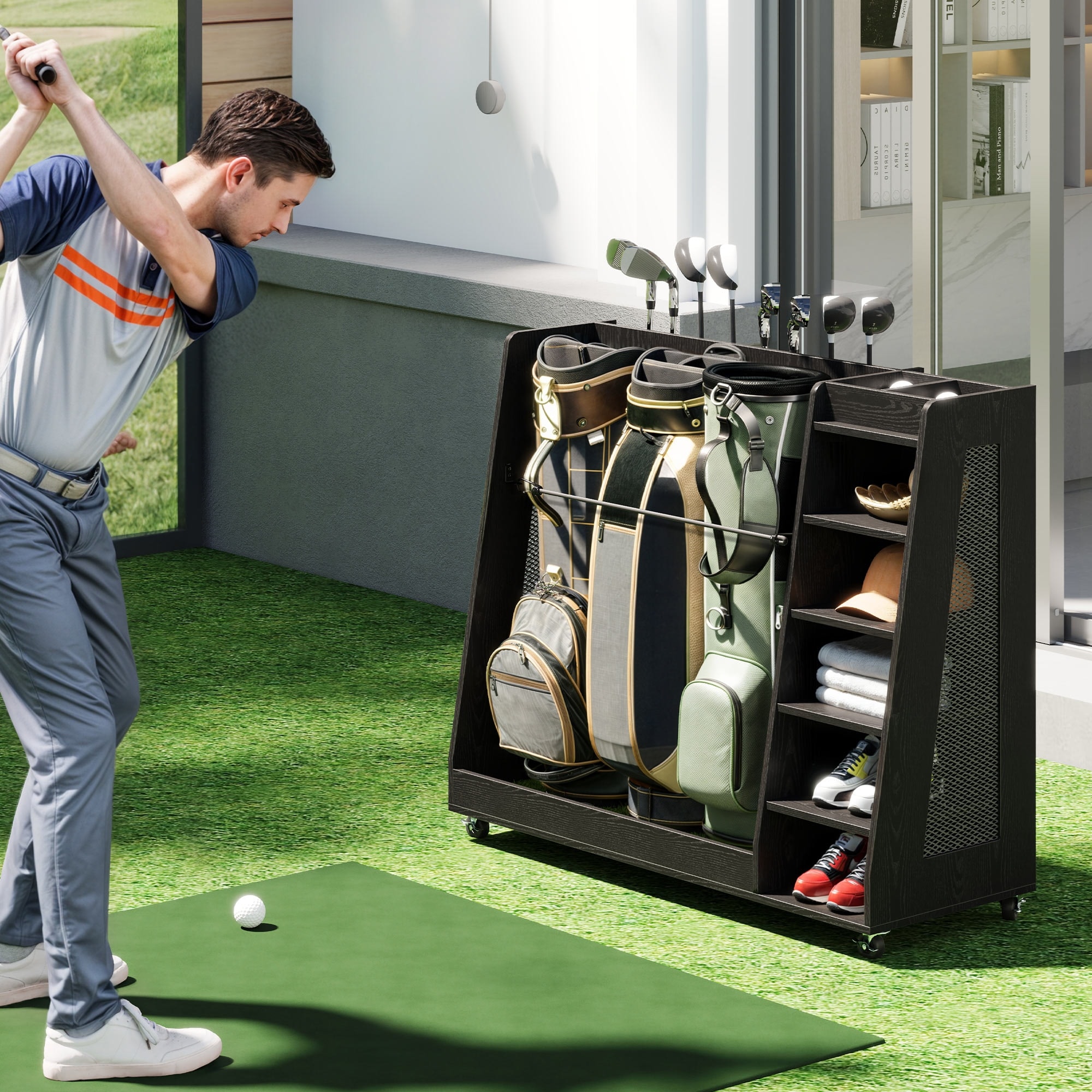 Moasis Wooden Golf Bag Organizer with Wheels for 2 or 3 Bags and Accessories Storage