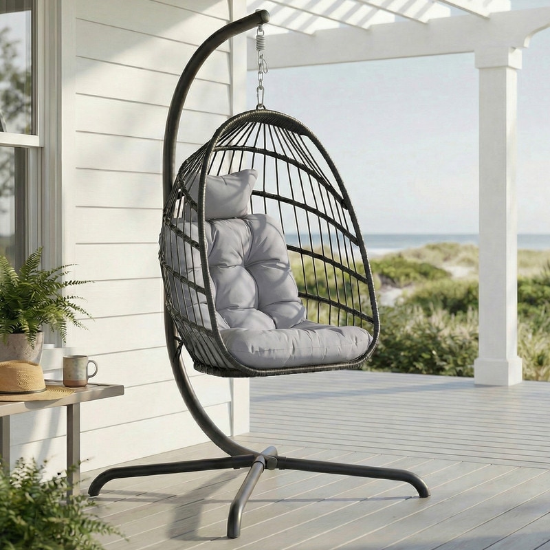 Oversized Wicker Hanging Egg Chair with Stand, Outdoor Indoor Swing Chair with Cushion, 350 lb Capacity