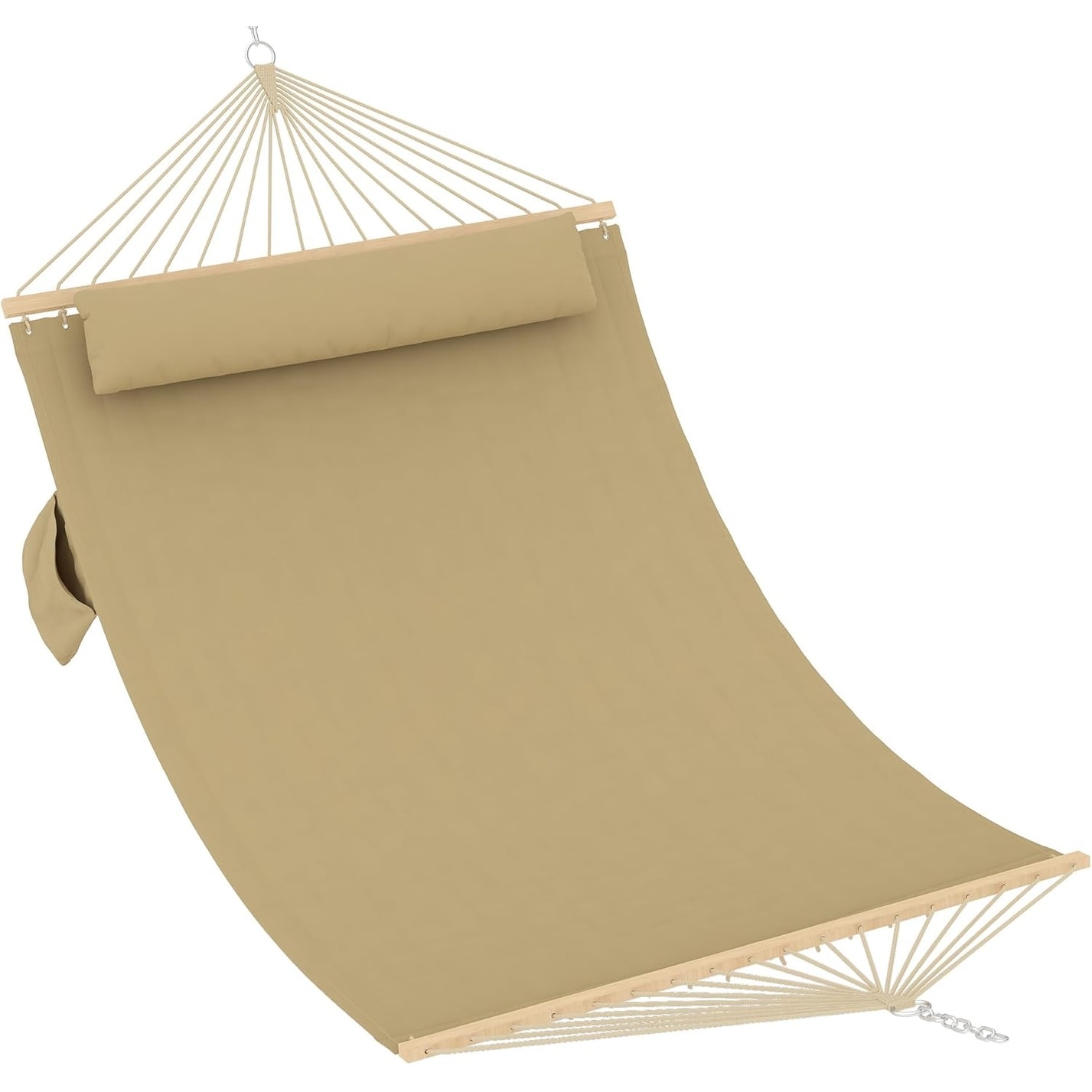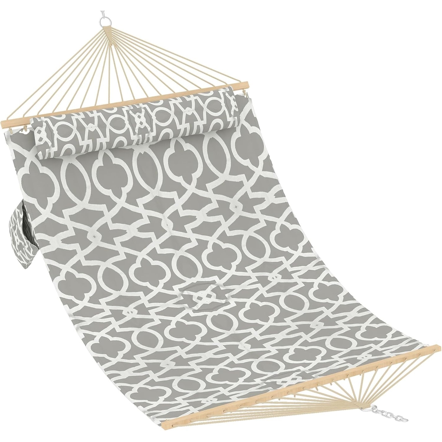 Quilted Double Hammock with Hardwood Bars & Pillow, 450lb Outdoor Hammock for Patio, Gray