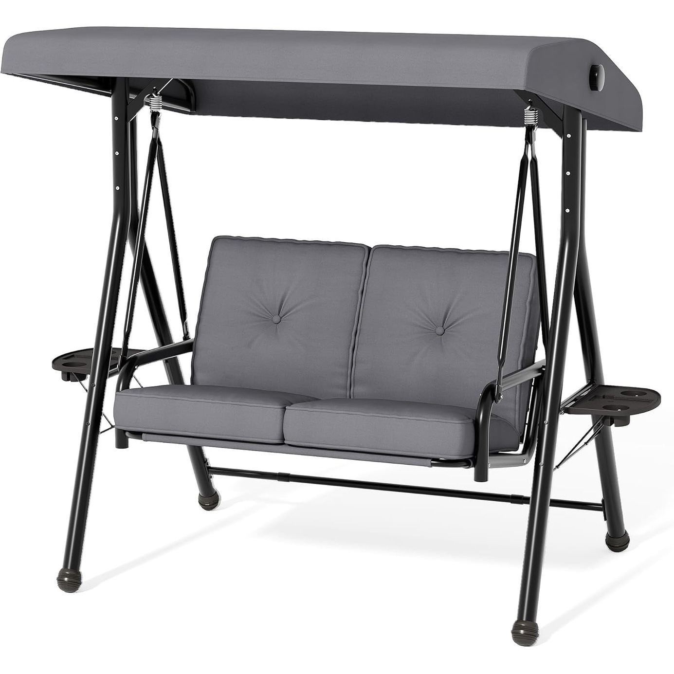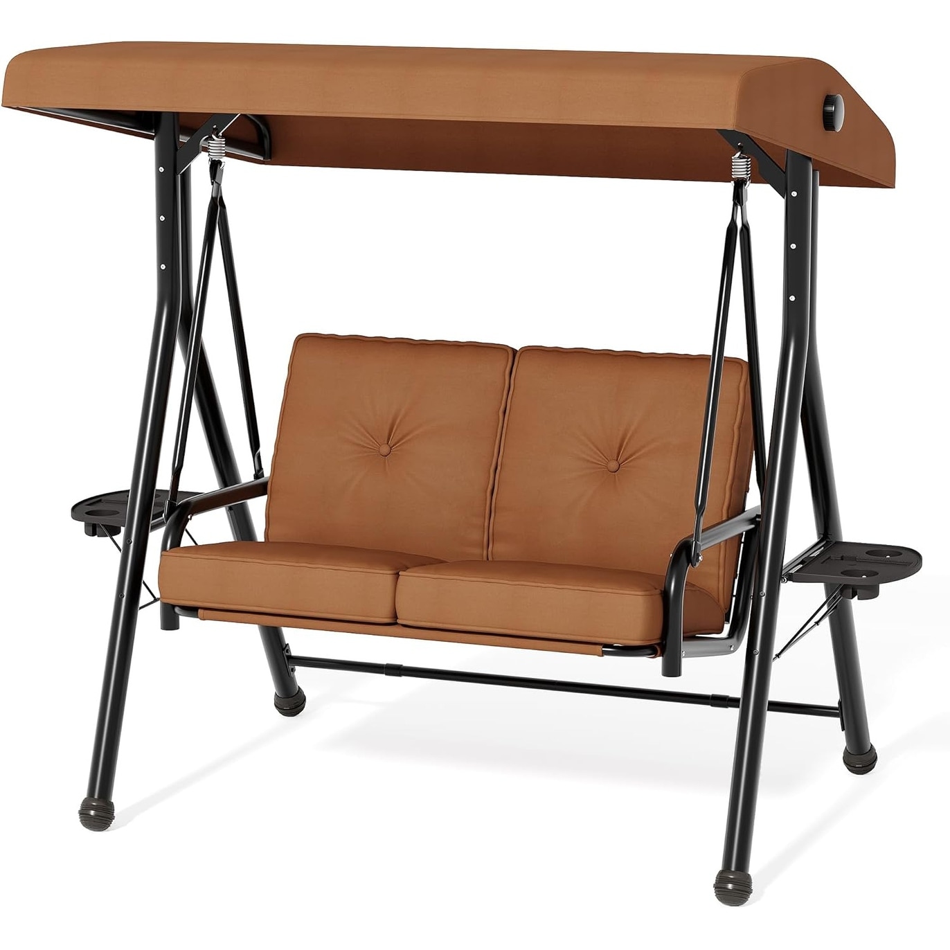 2-Seat Porch Swing with Stand, Cushions & Cup Holders, Steel Patio Swing for Garden, Red