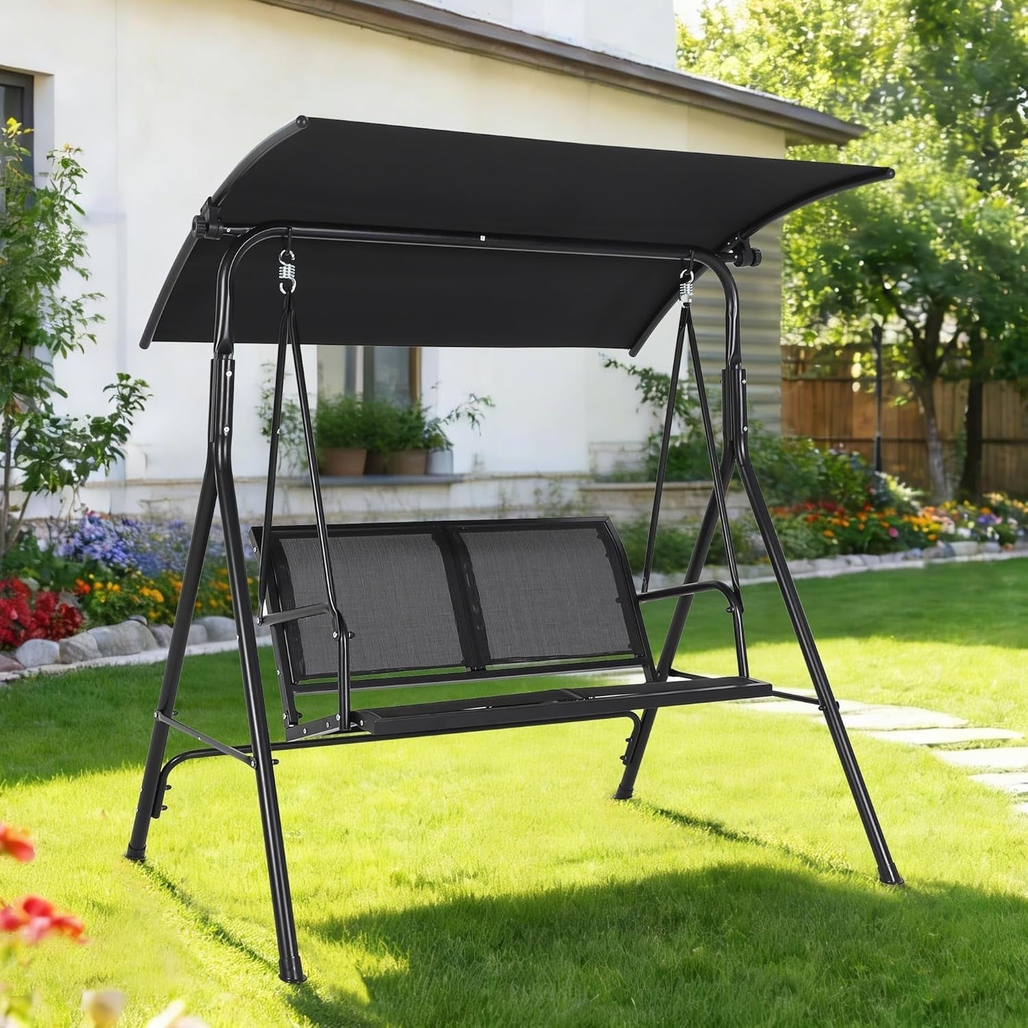 2-Seat Patio Swing with Canopy, Textilene Seat, 500lb Steel Frame for Garden & Lawn - Black2