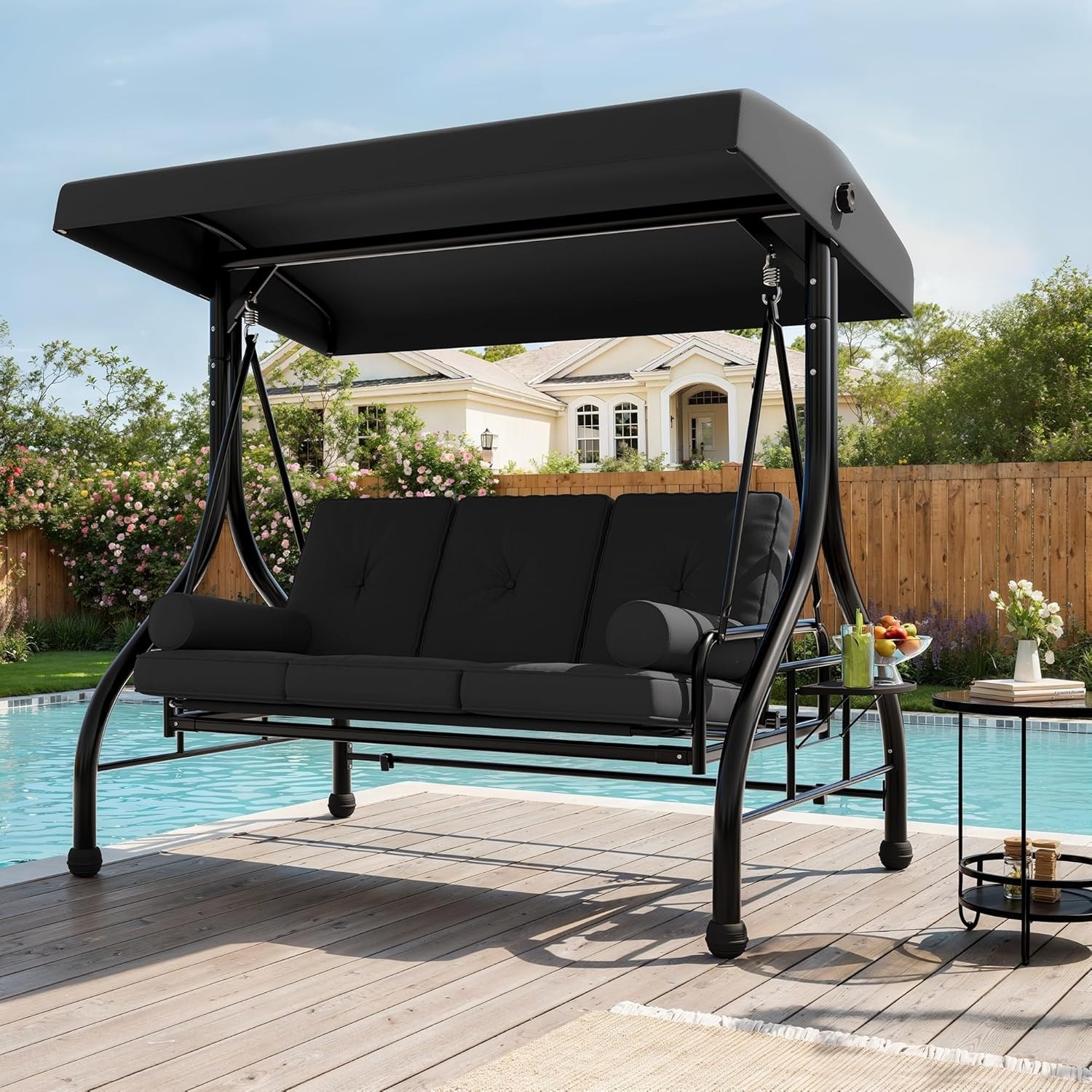3-Seat Outdoor Porch Swing with Canopy, 800lb Steel Patio Swing with Cushions & Cup Holders for Garden