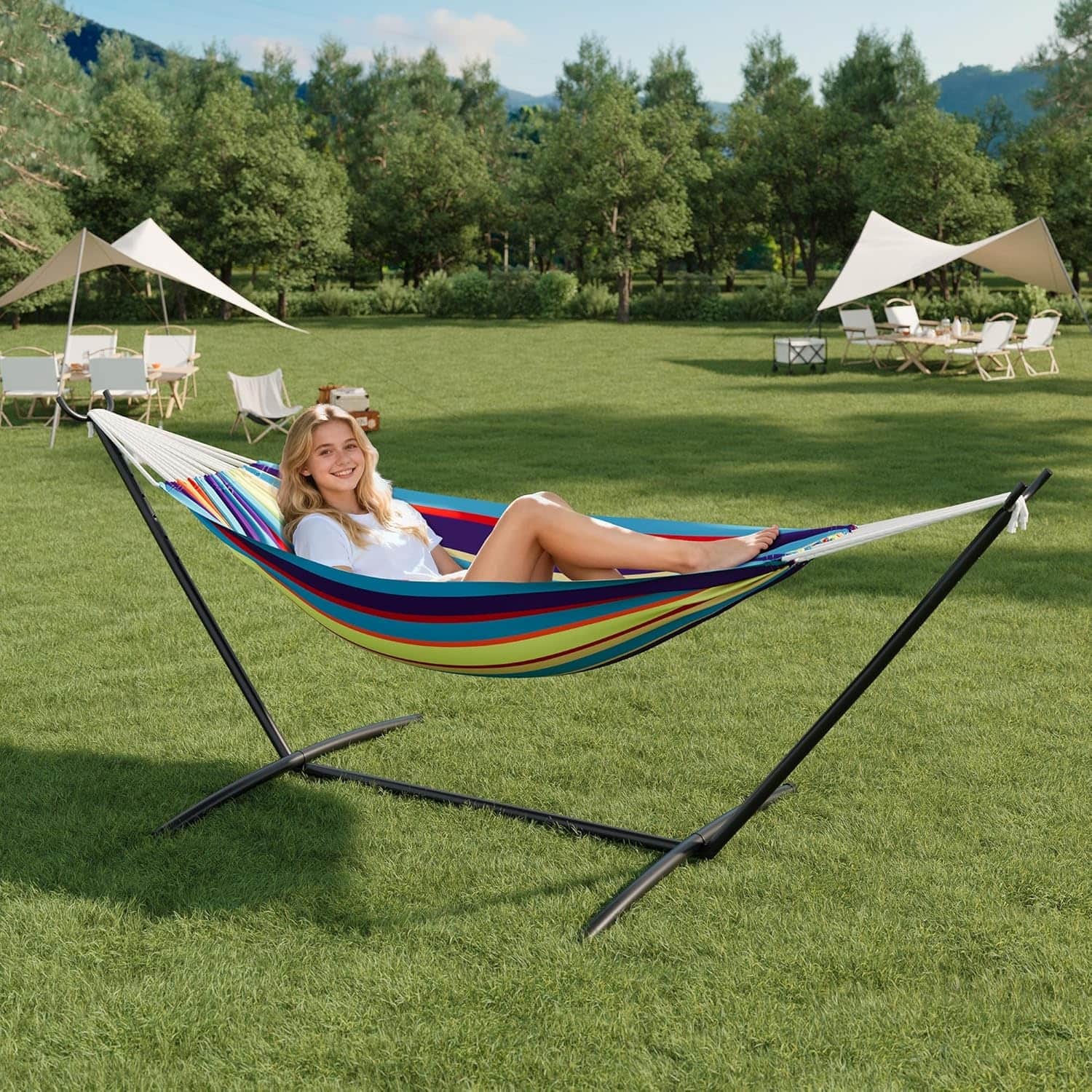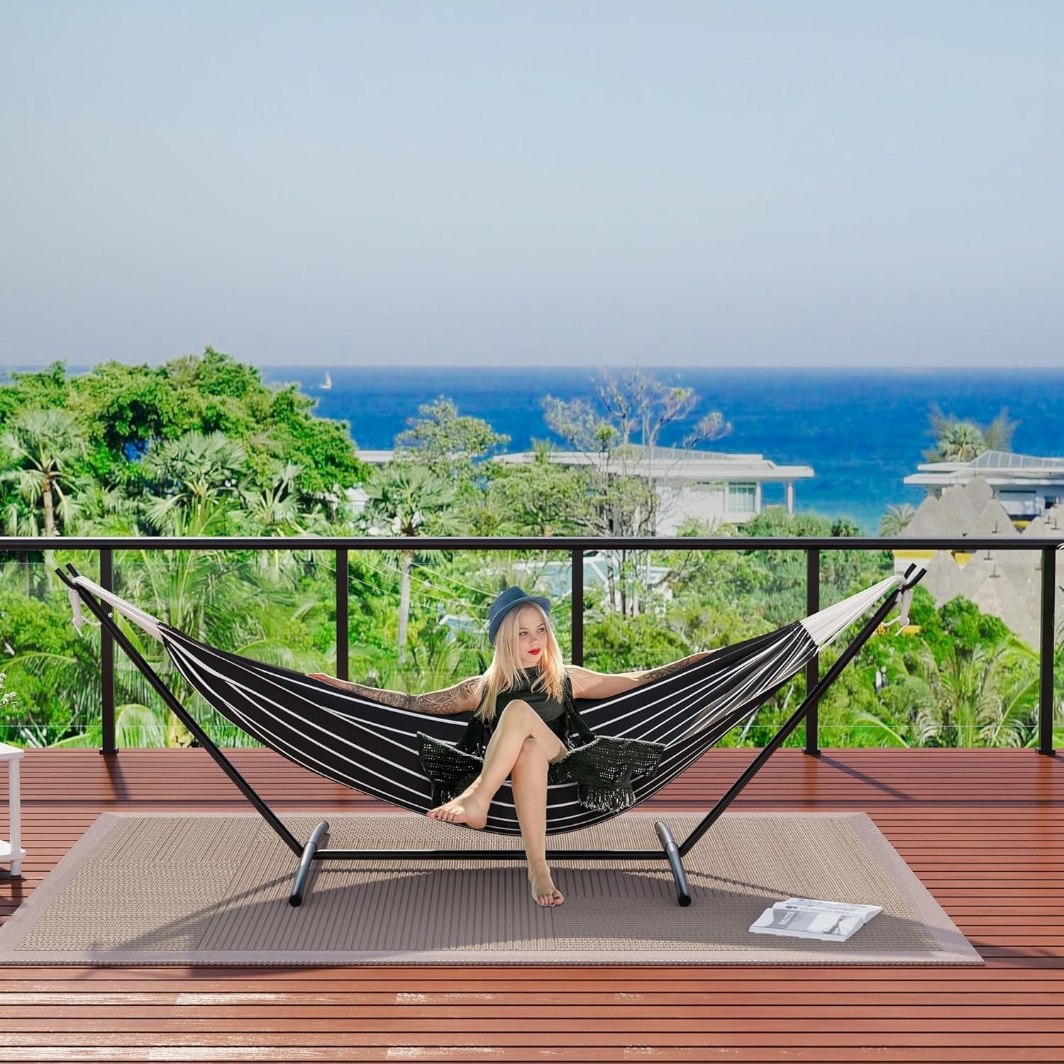 Double Cotton Hammock with Steel Stand, 450lb Brazilian Style Portable Hammock for Camping