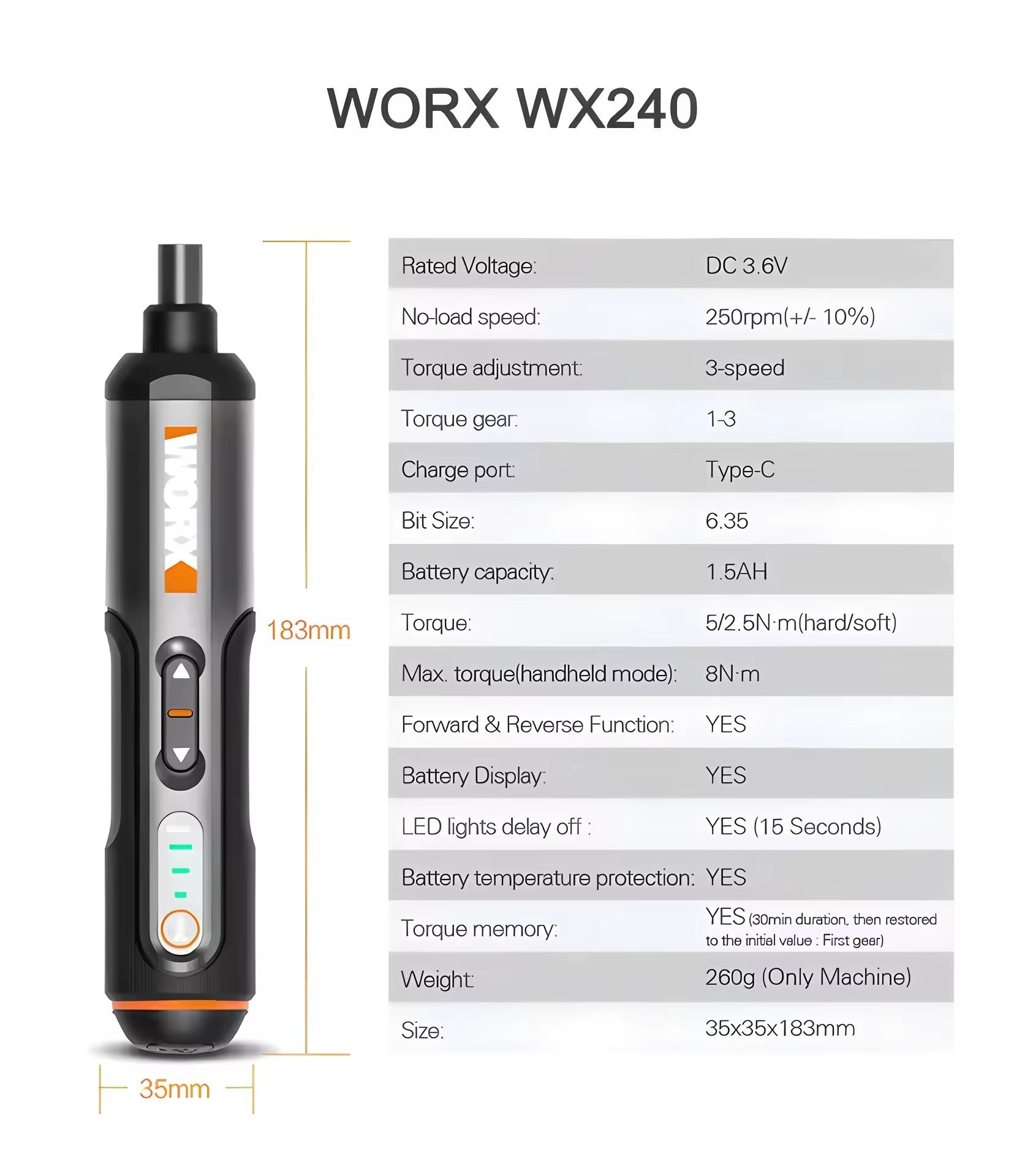 Worx WX242 Smart Cordless Electric Screwdriver Kit 30 Bit USB Rechargeable Set worx 240 cn