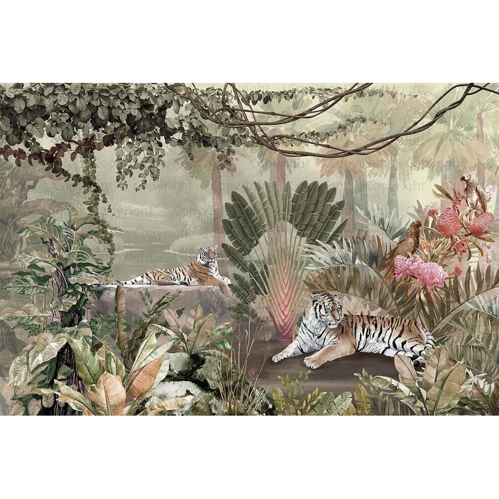 Exquisite Jungle Wallpaper Mural Tigers Tropical Flora Exotic Birds