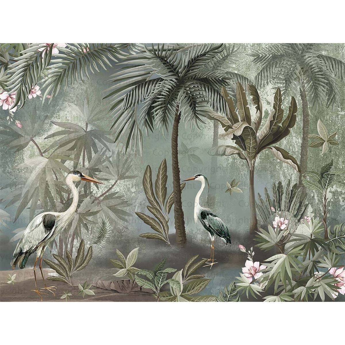 Serene Tropical Oasis Wallpaper Mural Herons and Palm Trees