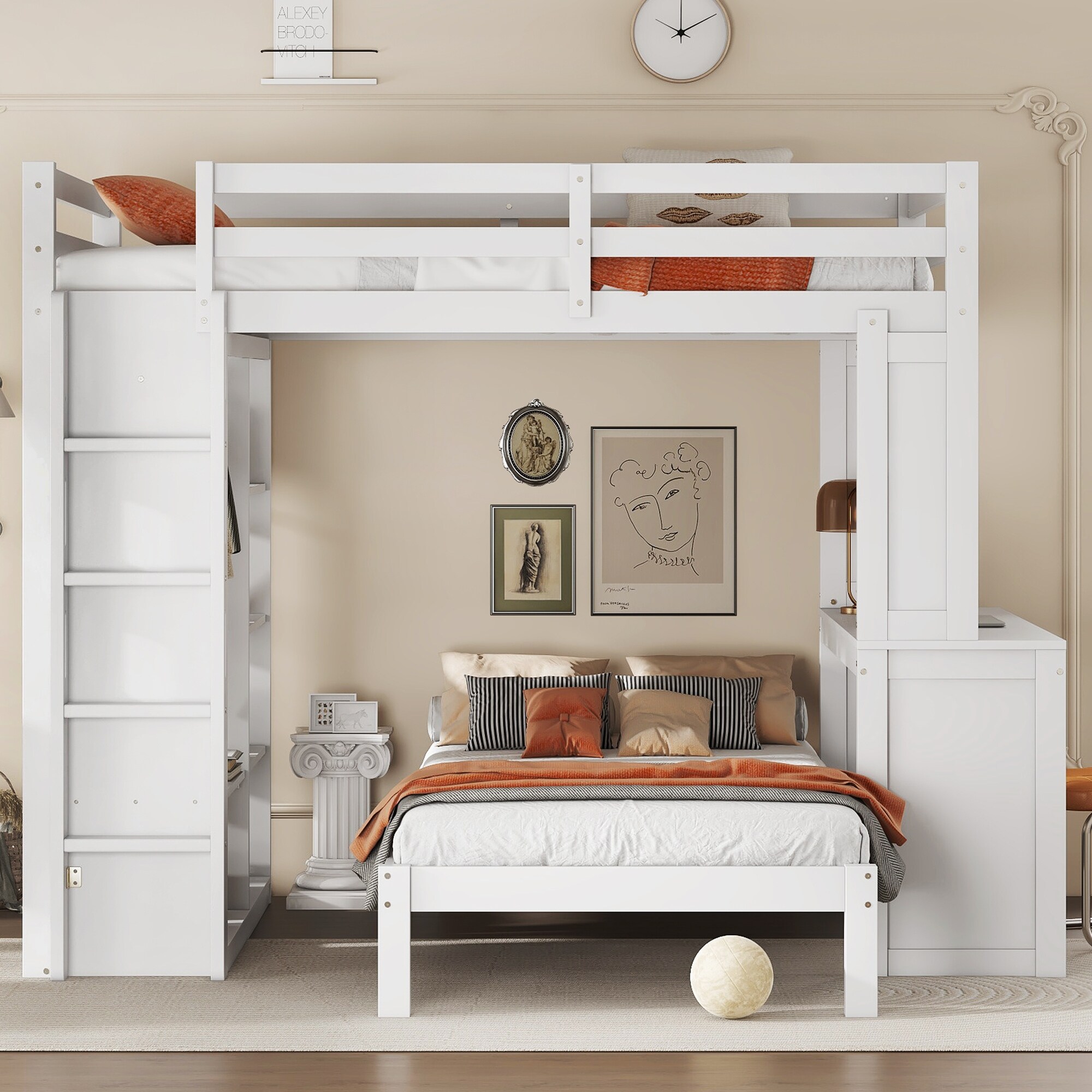 Bunk Bed w/Built-in Shelves, Desk & Wardrobe, Can be Converted into Loft Bed