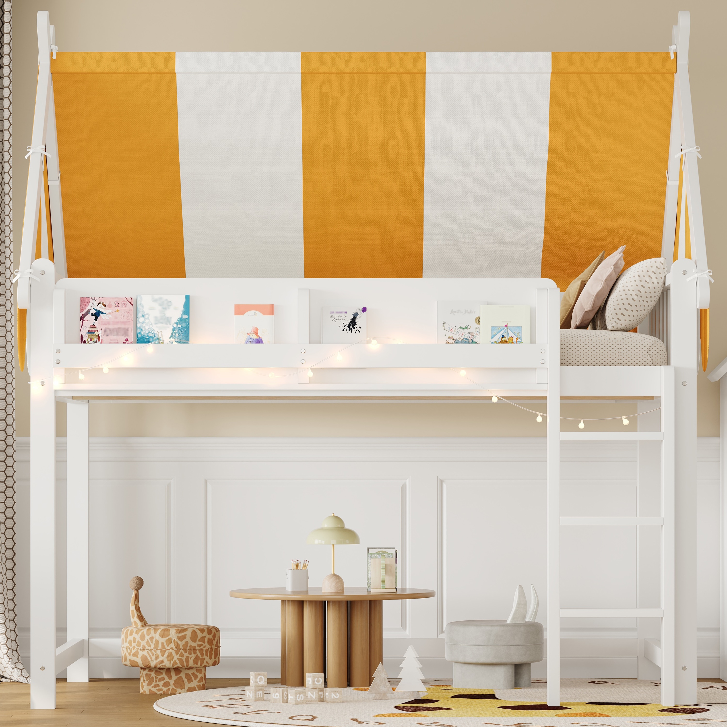 Loft Bed with Bright Yellow White Canopy, House-shaped Bed Frame Design with LED String Lights and Front Display Bookshelf
