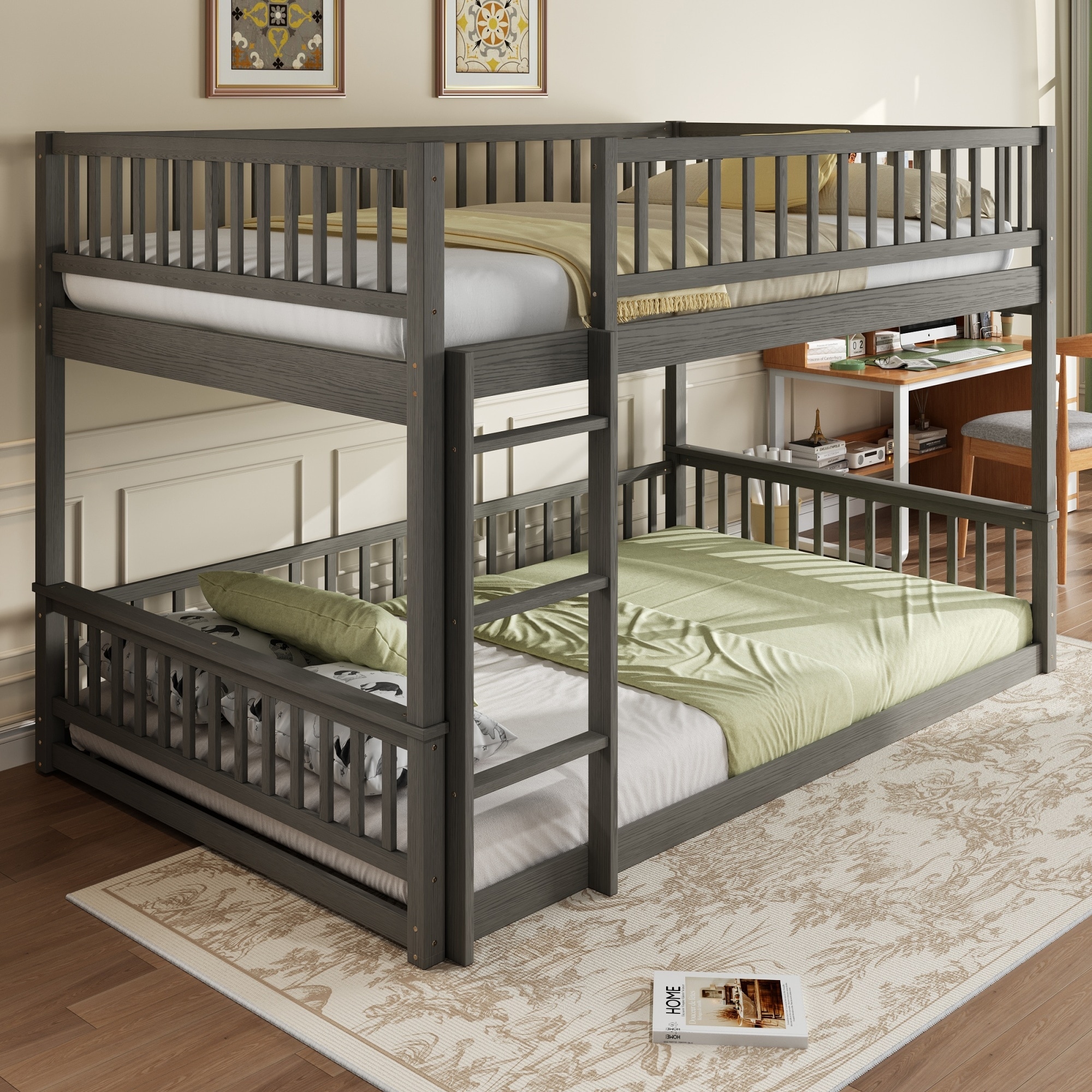 Queen Over Queen Solid Wood Floor Bunk Bed Frame w/ Ladder & Guardrails
