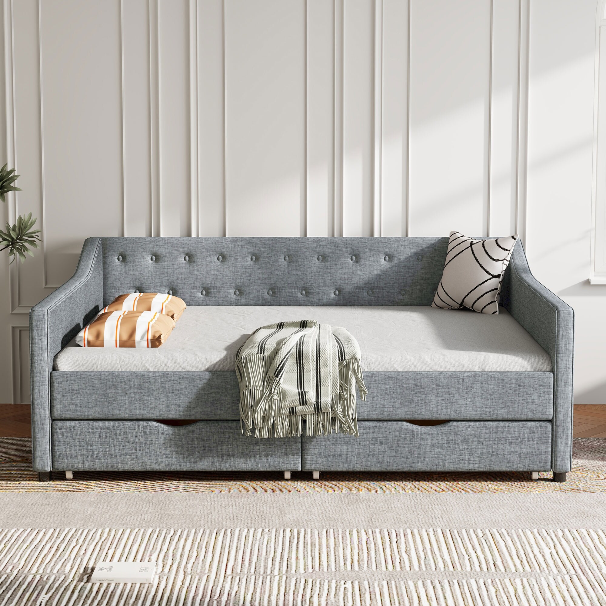 Linen Upholstered Daybed with 2 Drawers, Wooden Platform Sofa Bed Frame with Button Tufted Backrest, No Box Spring Needed